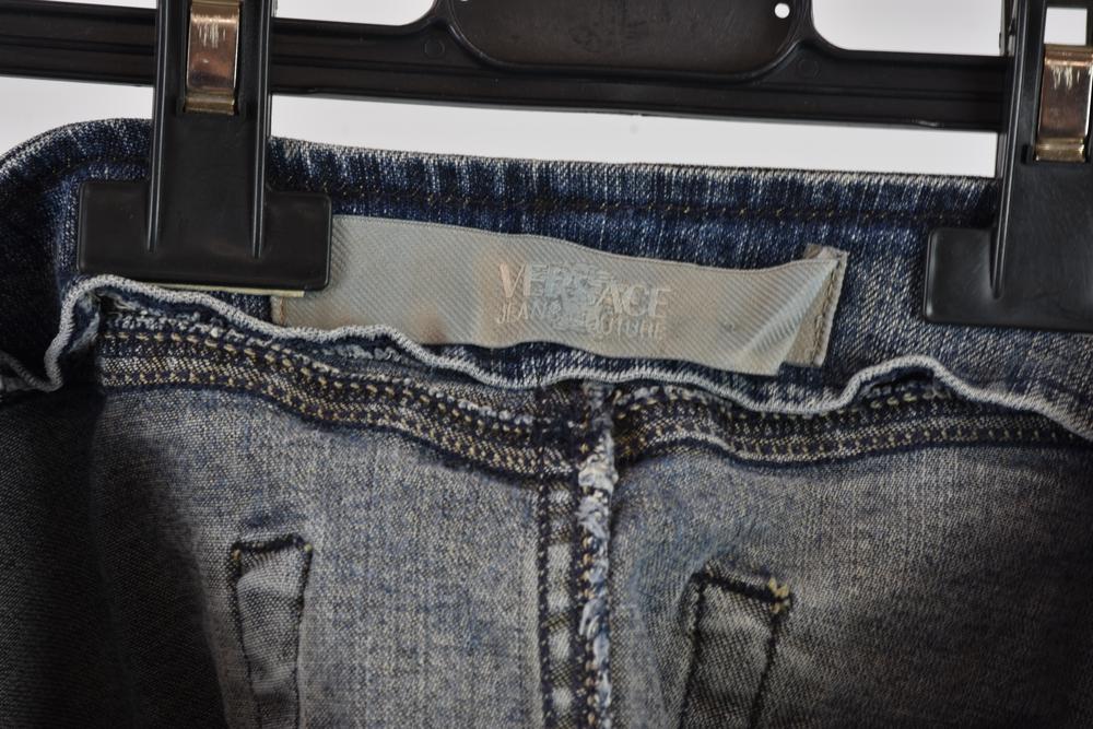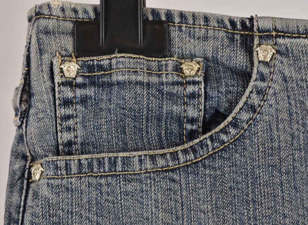 Five-pocket denim skirt with Medusa-head rivets. Size 46 IT. Made in Italy. Shows signs of use and aging. Well preserved.