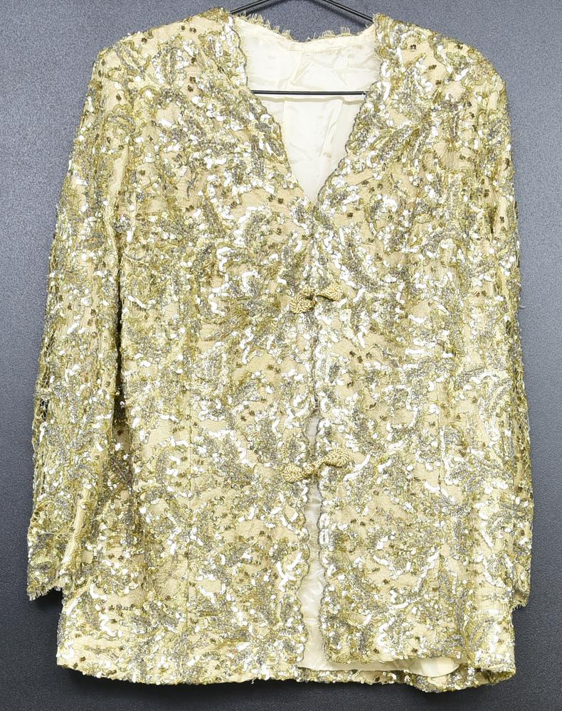 Giacca con decoro di paillettes dorate. Manca etichetta di taglia e composizione. Made in Italy. Lavorazione sartoriale. Vista la natura dell’articolo non si escludono piccole mancanze. Ben conservato.