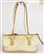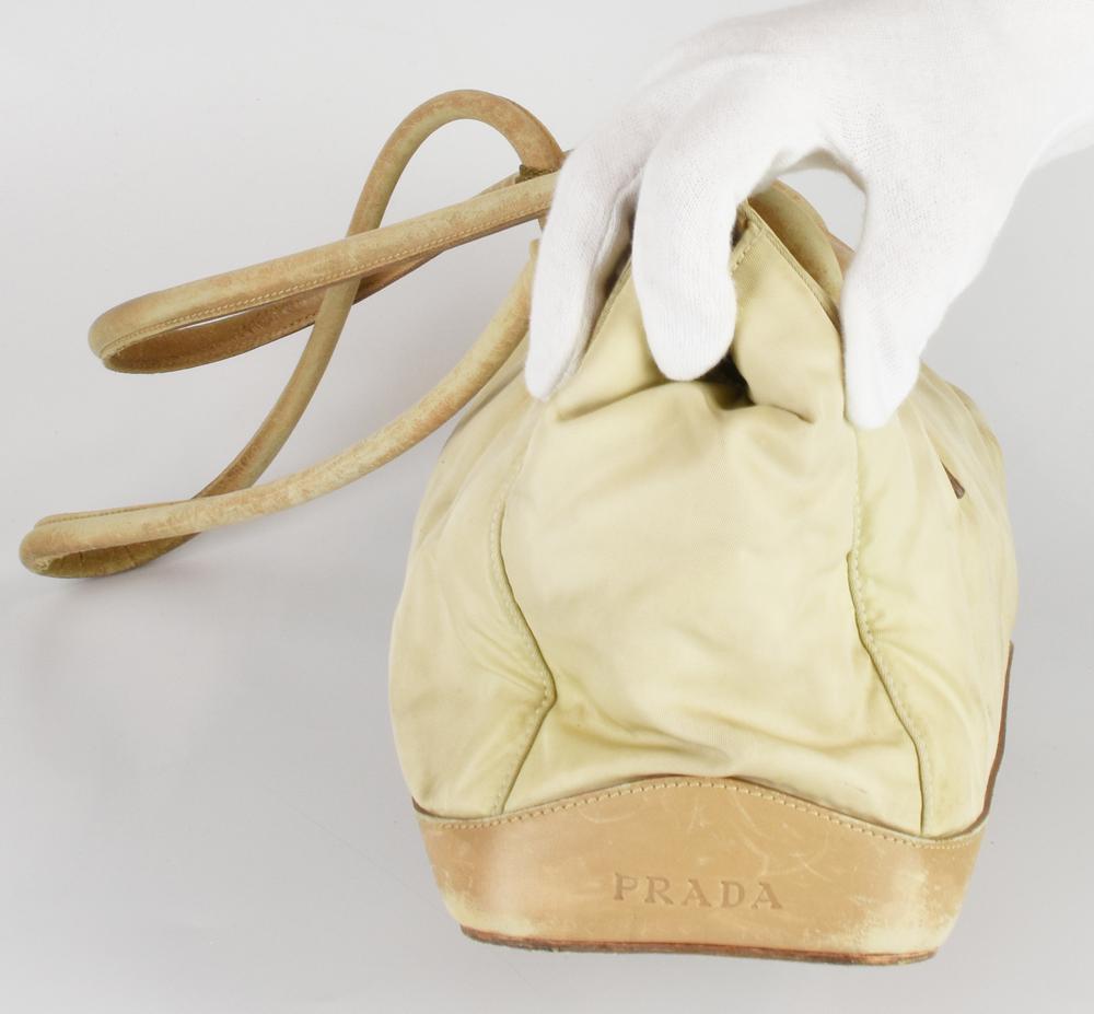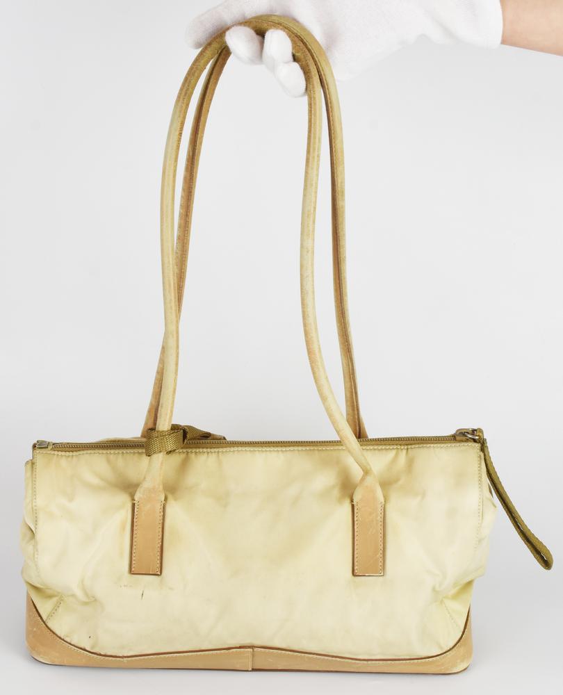 Sand-colored Re-Nylon bag with leather inserts and double handles. Central zipper closure. Interior lined with logo fabric, organized into a single compartment with a side pocket with a zipper. Metal label inside. Dimensions: 32.0x15.0x11.0 cm. Product reference code: 7 P. Widespread defects and signs of use. Fairly well preserved.