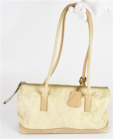 Borsa in Re-Nylon color sabbi con inserti in pelle e doppi manici. Chiusura centrale con cerniera. Interno in tessuto logato organizzato in un unico vano con taschino laterale con cerniera. Etichetta metallica all’interno. Cm 32,00x15,00x11,00. Codice riferimento prodotto: 7 P. Diffusi difetti e segni d’uso. Discretamente conservata.