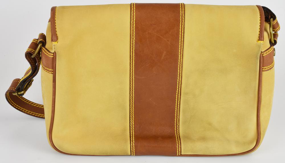 Borsa a tracolla in suede con inserti e profili in pelle. Tracolla regolabile. Chiusura frontale con patta e fibbie. Interno in pelle organizzato in un unico vano con taschino laterale con cerniera. All’esterno reca due tasche frontali con chiusura con cerniera. Corredata di dustbag originale. Cm 27,50x22,00x7,50. Aloni dovuti all’uso ma buone condizioni generali. Ben conservata.