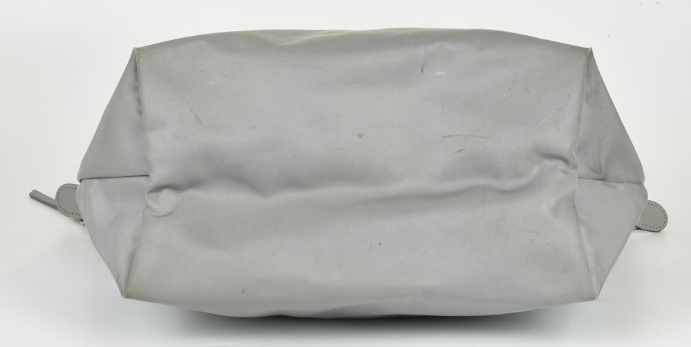Borsa pieghevole in tessuto tecnico e inserti in pelle. Doppi manici e chiusura centrale con cerniera e bottone a pressione. Interno organizzato in un unico vano con due taschini laterali piatti. Cm 26,00x26,00x16,00. Altezza coi manici cm 48,00. Prodotto in Cina. Diverse macchie. Discretamente conservata.