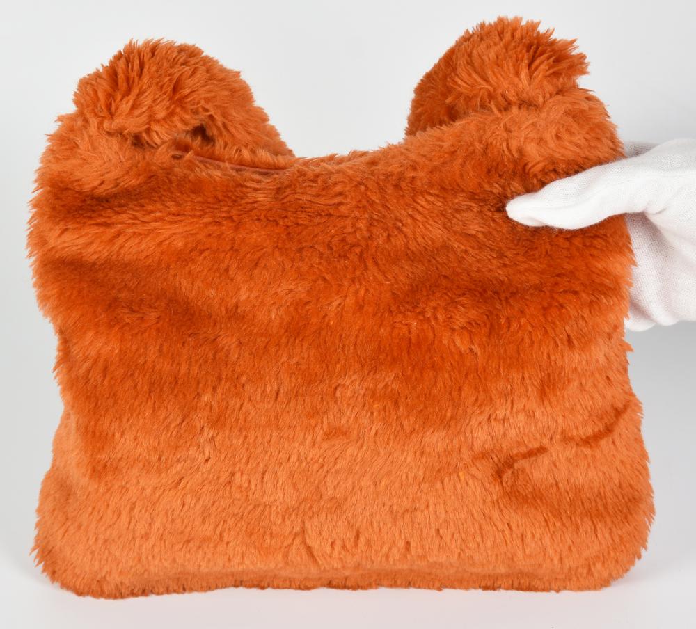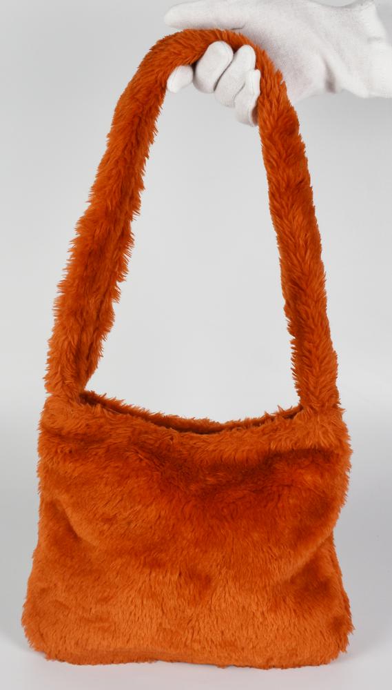 Shoulder bag in orange faux fur. Central zipper closure. Interior organized into a single compartment with a side zippered pocket. Dimensions: 25.0x20.0x3.0 cm. Well preserved.