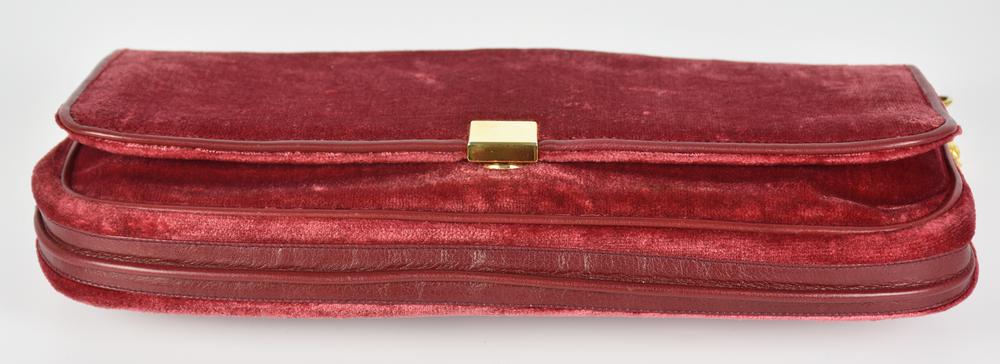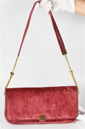 Shoulder bag in velvet with tone-on-tone leather inserts and trims. Central flap with snap closure. Branded interior organized into a single compartment with a side zippered pocket. Gold-tone metal hardware. Dimensions: 33.0x18.0x3.0 cm. Slight signs of wear but generally very well preserved.