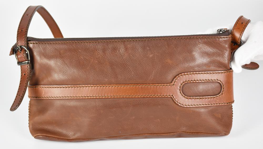 Brown leather shoulder bag with adjustable handle. Zipper closure. Interior organized into a single compartment with a side zippered pocket. Chrome metal hardware. Dimensions: 30.5x15.0x4.5 cm. Made in Italy. Shows signs of wear but is generally well preserved.