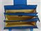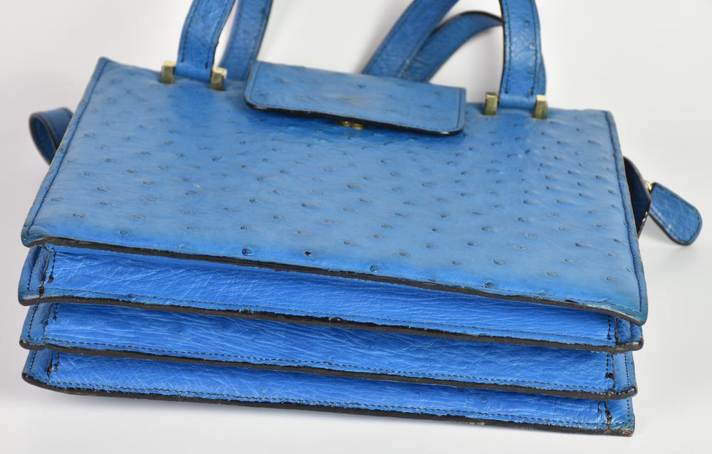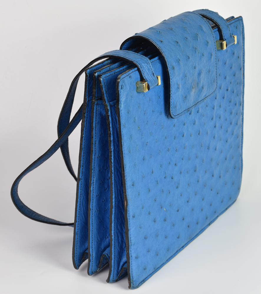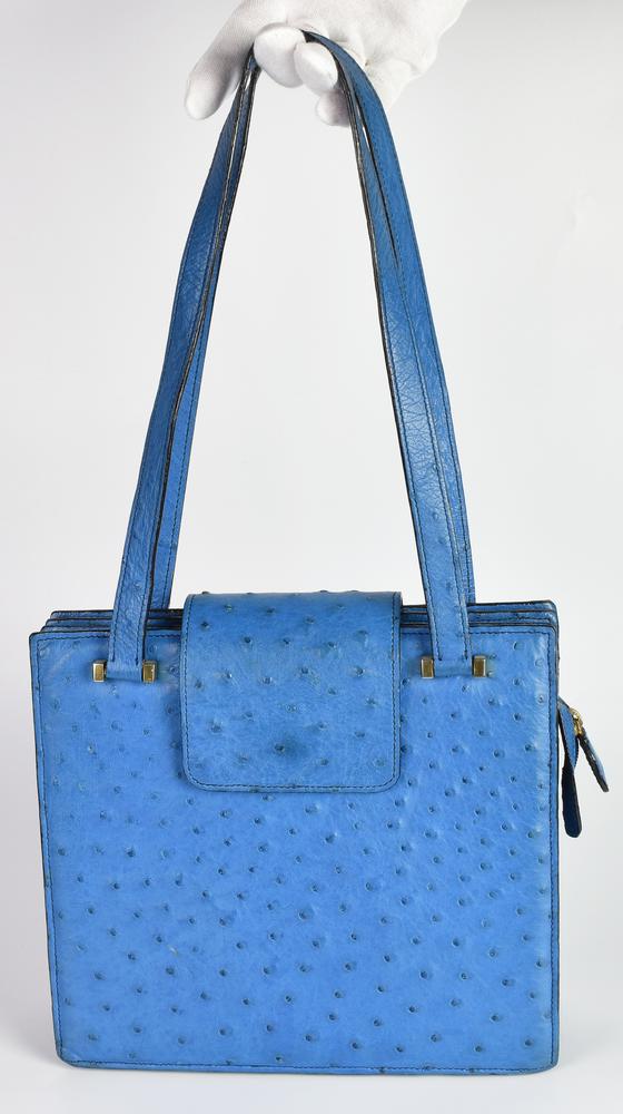 Light blue ostrich leather bag with three compartments and bellows closure, 25x27x6 cm, handle width 27 cm. Laurence, Turin. Well preserved.