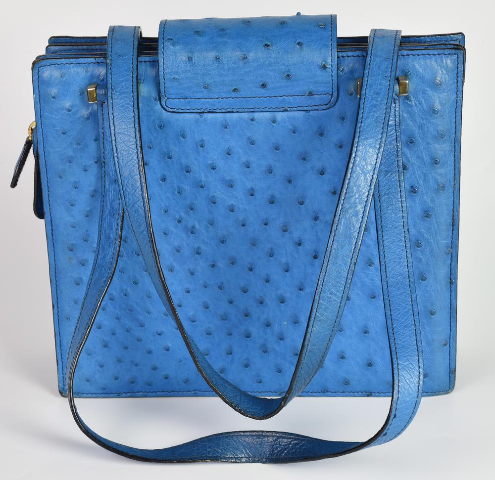 OSTRICH LEATHER BAG DESCRIPTION: Light blue ostrich leather bag with three...