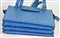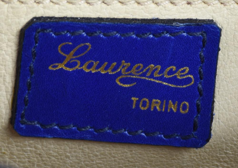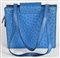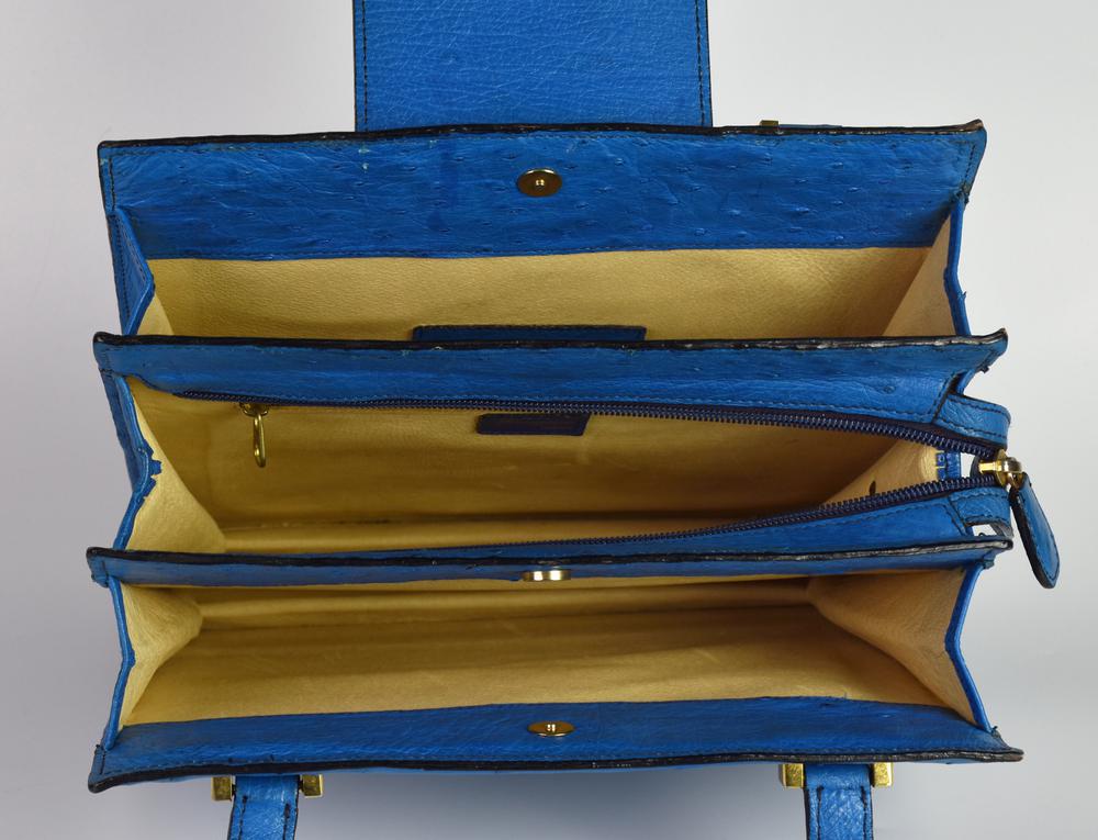 Borsa in pelle di struzzo azzurra a tre scomparti e chiusura a soffietto, cm 25x27x6, ampiezza manici cm 27. Marca Laurence, Torino. Ben conservata.