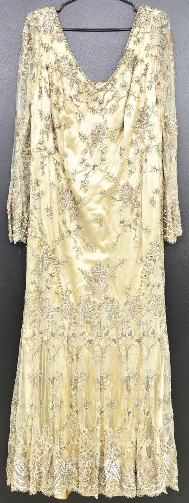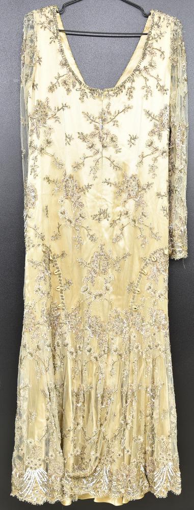 Abito da sera con decoro di paillettes dorate. Manca etichetta di taglia e composizione. Made in Italy. Lavorazione sartoriale. Vista la natura dell’articolo non si escludono piccole mancanze. Ben conservato.