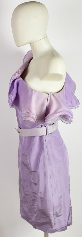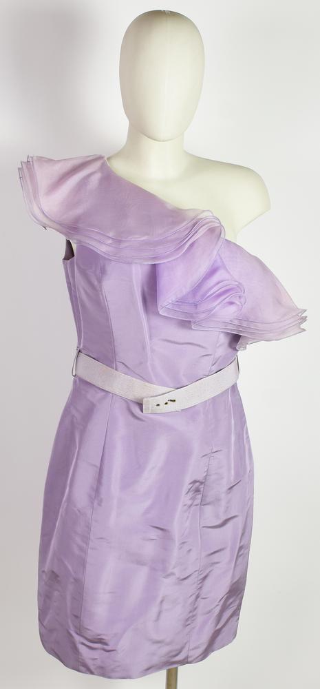 One-shoulder silk dress with ruffle embellishment and waist belt. Size 46 IT. Made in Italy. Some signs of yellowing. Still with tags. Well preserved.