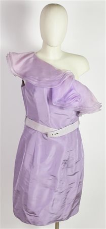Abito monospalla in seta con decoro a volants e cintura in vita. Taglia 46 IT. Prodotto in Italia. Qualche segno di ingiallimento. Ancora con cartellino. Ben conservato.