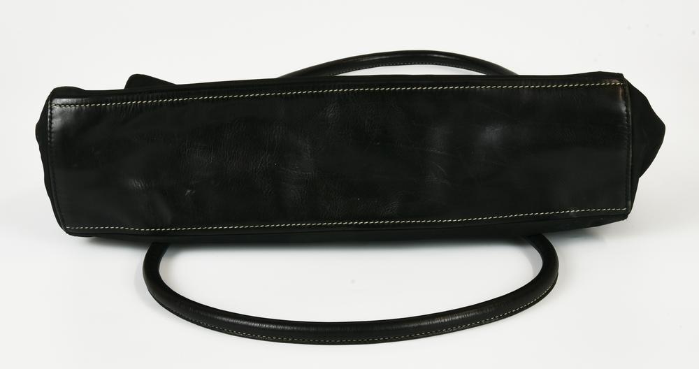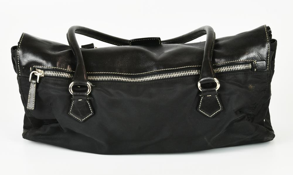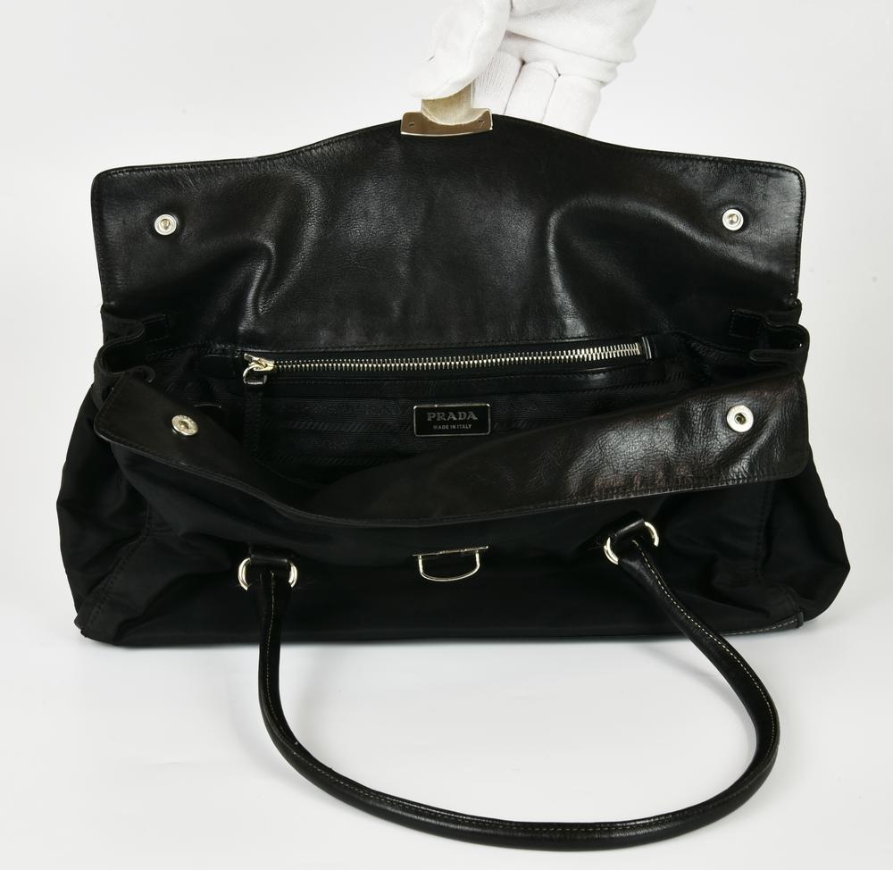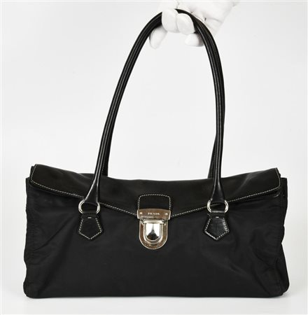 Borsa a spalla modello Easy Bag con doppi manici, di colore nero, in nylon con inserti in pelle. Presenta doppia patta e chiusura frontale metallica a pressione. Interno in tessuto logato organizzato in un unico vano con taschino laterale con cerniera. All’esterno reca una tasca posteriore con chiusura a cerniera. Presenta logo metallico della Maison sul lato. Hardware in metallo cromato. Cm 34,50x19,00x9,00. Altezza con i manici cm 40,00. Prodotta in Italia. Ben conservata.