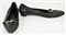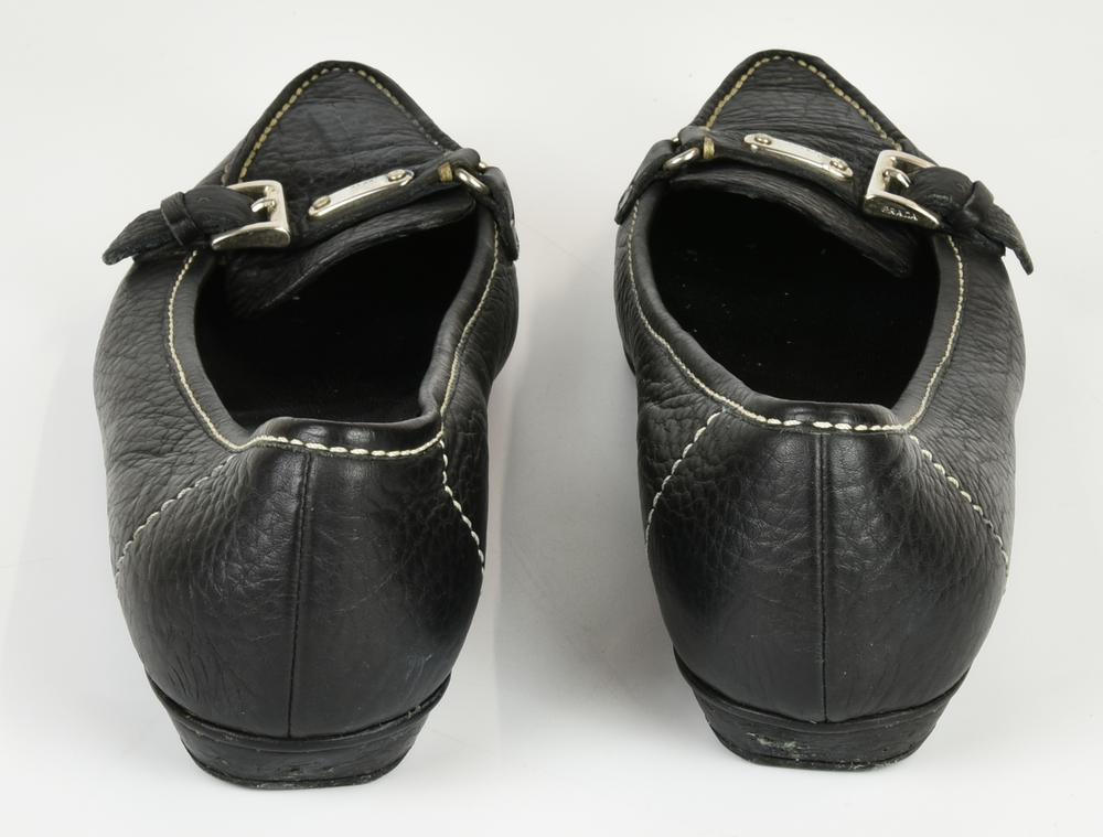 Black leather pointed shoes with contrasting piping. Toe decorated with a buckle and metal tag. Size 38.5. Made in Italy. Some signs of wear but overall in very good condition. Well preserved.