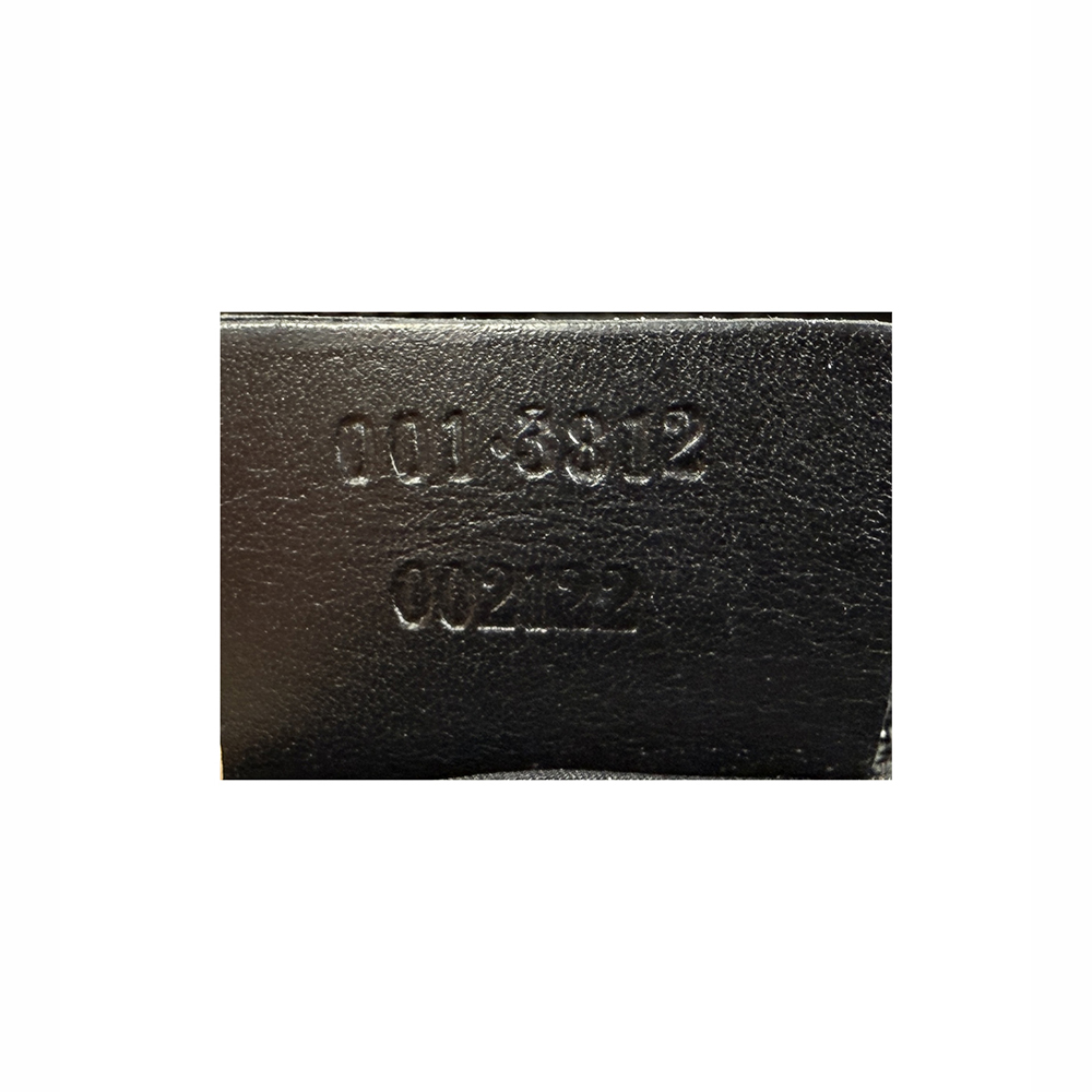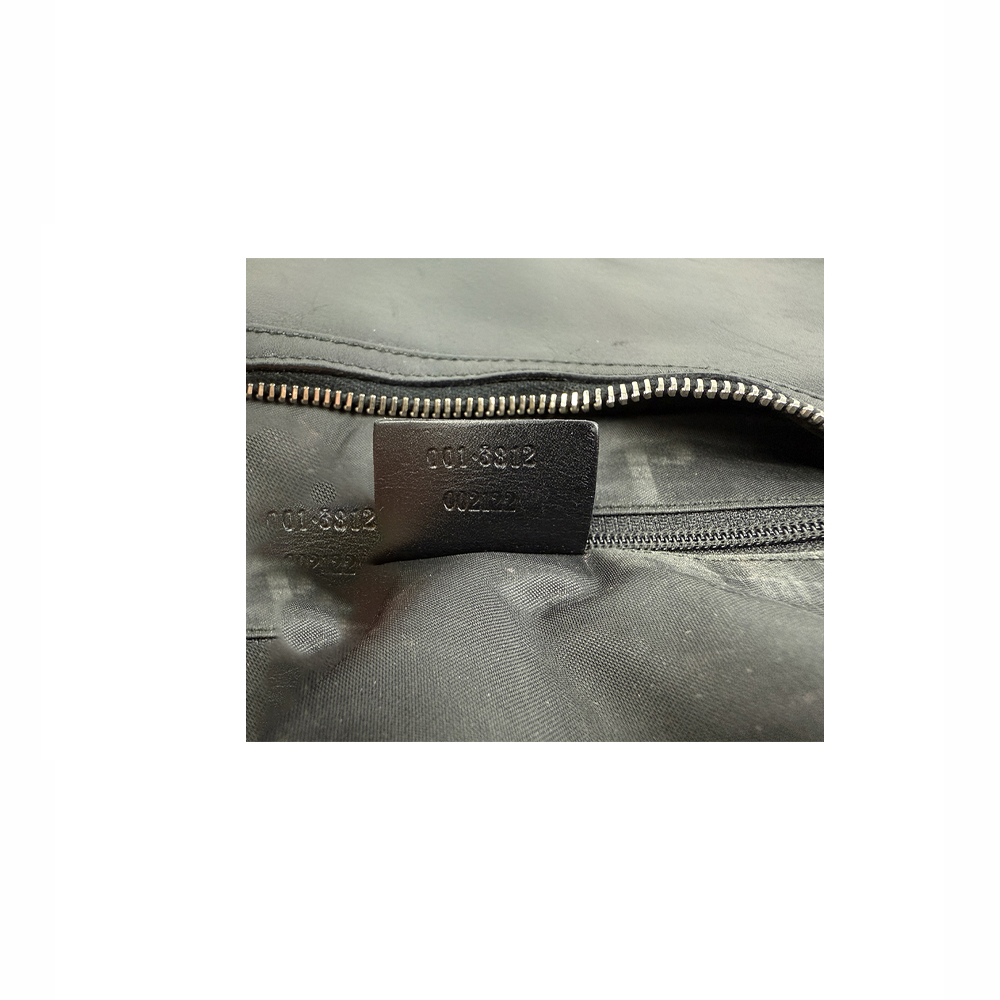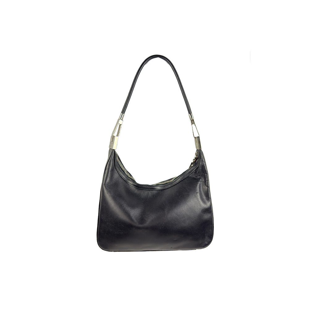 GUCCI, elegante borsa a spalla modello Jackie in morbida pelle nera liscia con iconico tira lampo a doppia GG intrecciata in metallo argentato. Dotata di manico rigido in pelle con finiture in metallo argento lucido, chiusura superiore a zip. Interno foderato in tessuto logato (GG) nero con tasca laterale. Italia primi anni 2000 h cm 28 x 26,5 x 7