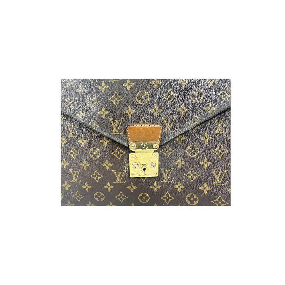 LOUIS VUITTON, MODELLO PORTE-DOCUMENT VOYAGE (Serviette Ambassadeur) materiale tela Monogram con finiture in vacchetta naturale, fodera interna in pelle marrone, finiture metalliche in ottone dorato chiusura serratura a scatto con placca metallica e scritta Louis Vuitton manico in pelle marrone rigido singolo, interno a tre scomparti. h cm 28 x 37,5 x 6