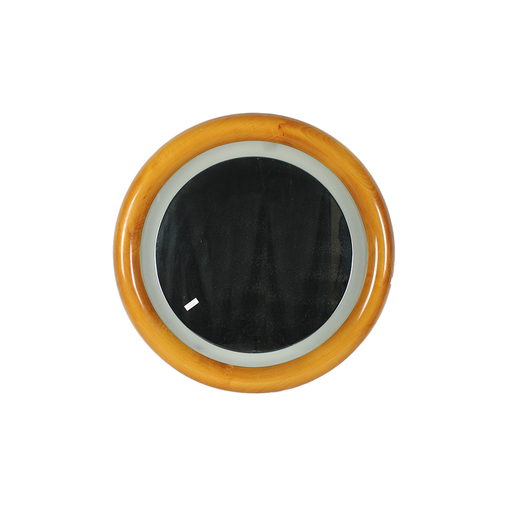 SPECCHIERA ROTONDA in legno chiaro e vetro satinato retro illuminato produzione italiana periodo stimato anni 60 cm Ø 71