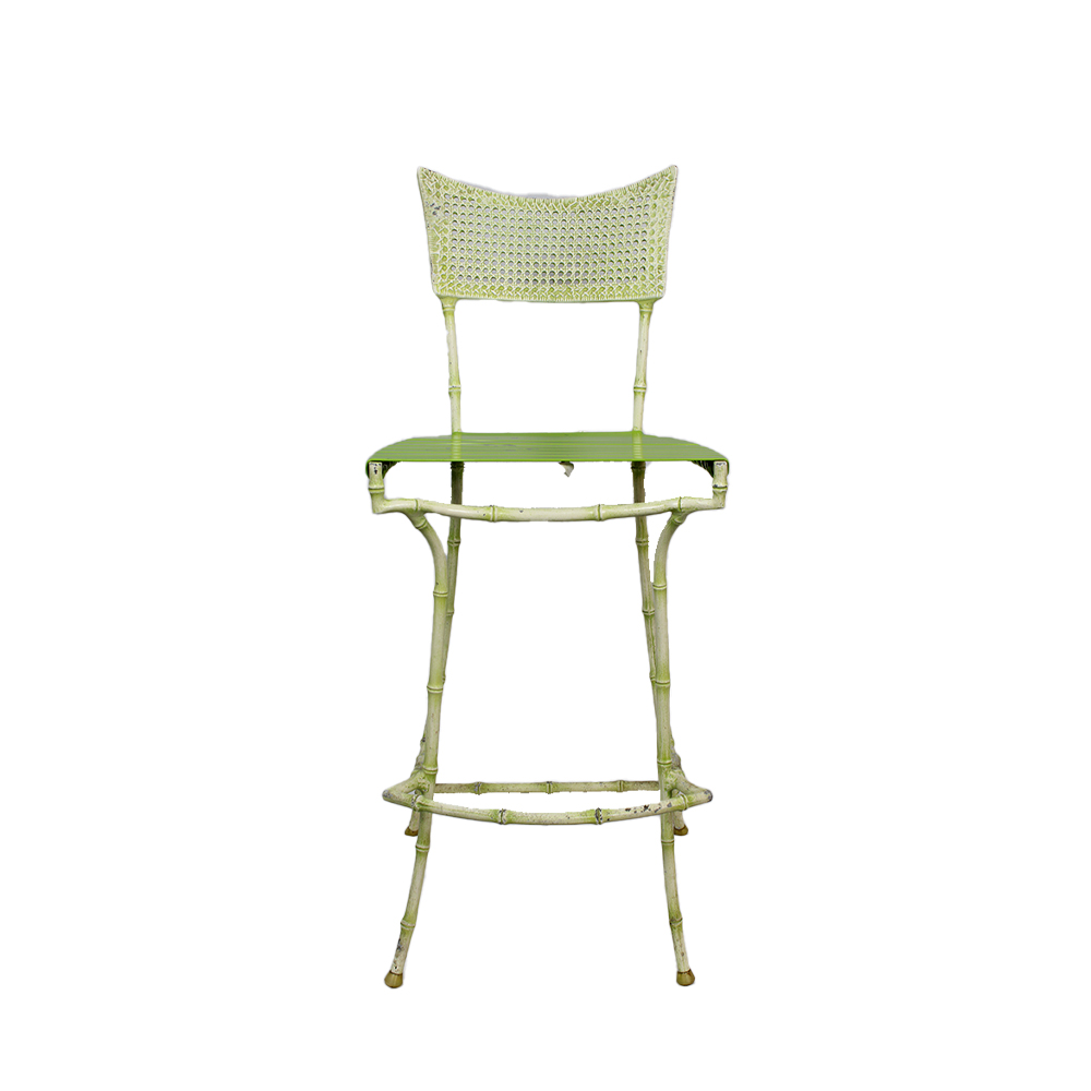 SEDIA DA BANCO in ferro verniciato per la struttura in stile bambù per la seduta, il materiale presente è in pvc e per la spalliera la paglia di Vienna, la sedia si presenta in ottime condizioni ma con normali segni del tempo periodo stimato anni 60 h cm 114 x 45 x 55