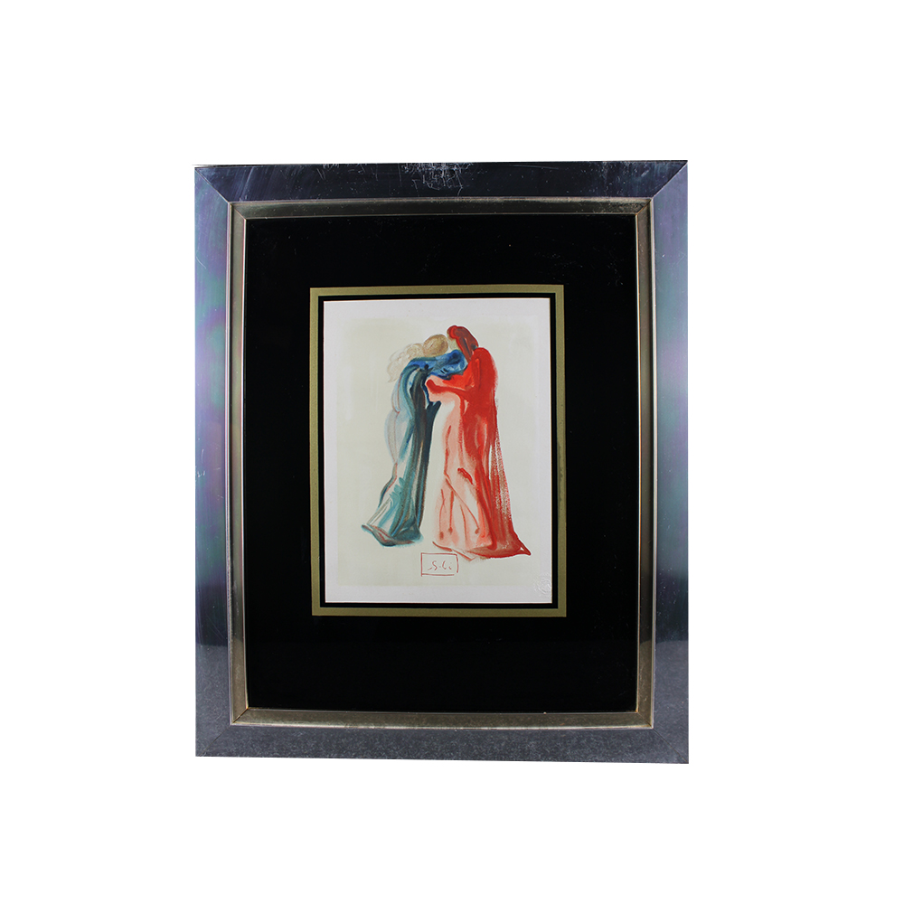 SALVADOR DALÌ (1904-1989) Xilografia originale su legno, firmata in lastra, facente parte della celebre serie della Divina Commedia realizzata su commissione dello Stato italiano e pubblicata dalle Edizioni Pregiate S.p.A, Roma. L'opera è intitolata Dante e Beatrice, tavola XXIX del Purgatorio , stampata su carta pregiata. Esemplare n. 124/200 . Reca sul retro certificato d'originalità' su carta con timbro dell'editore e firma stampata dall'artista, datato Hotel Meurice , Parigi, 24 novembre 1974 h cm 28 x 21 - cornice h cm 56 x 46