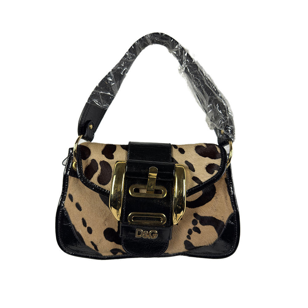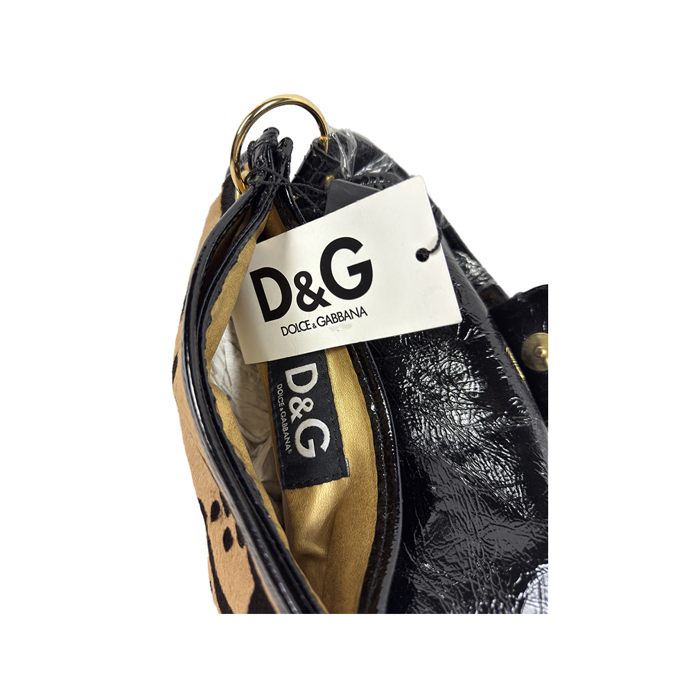 DOLCE & GABBANA borsa animalier con fibbia oro, modello mini bag della linea giovane D&G, colore nero e stampa beige leopardata dettagli in pelle nera lucida (vernice) chiusura con patta frontale con fibbia metallica dorata e bottone magnetico, manico corto regolabile con fibbie, interno con fodera oro e taschino laterale. Completa di etichetta. h cm 16 x 24 x 7