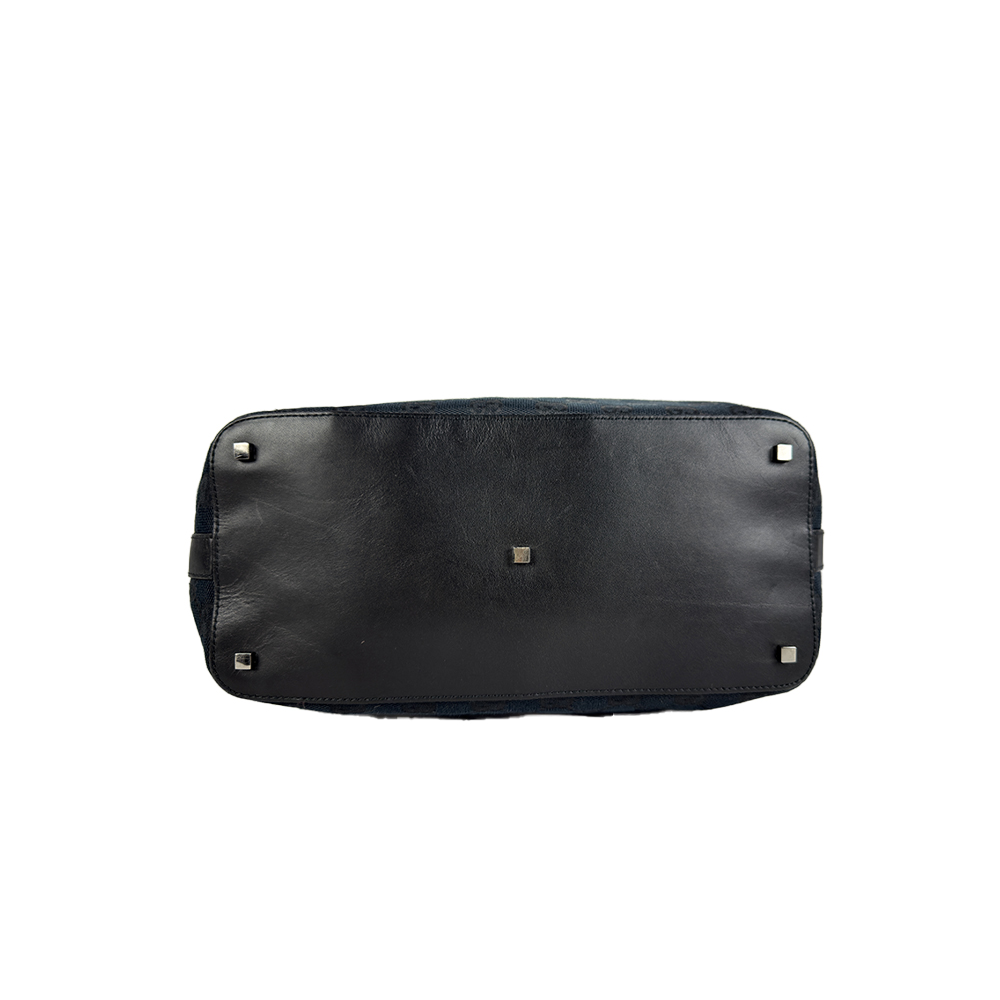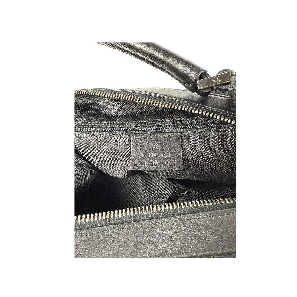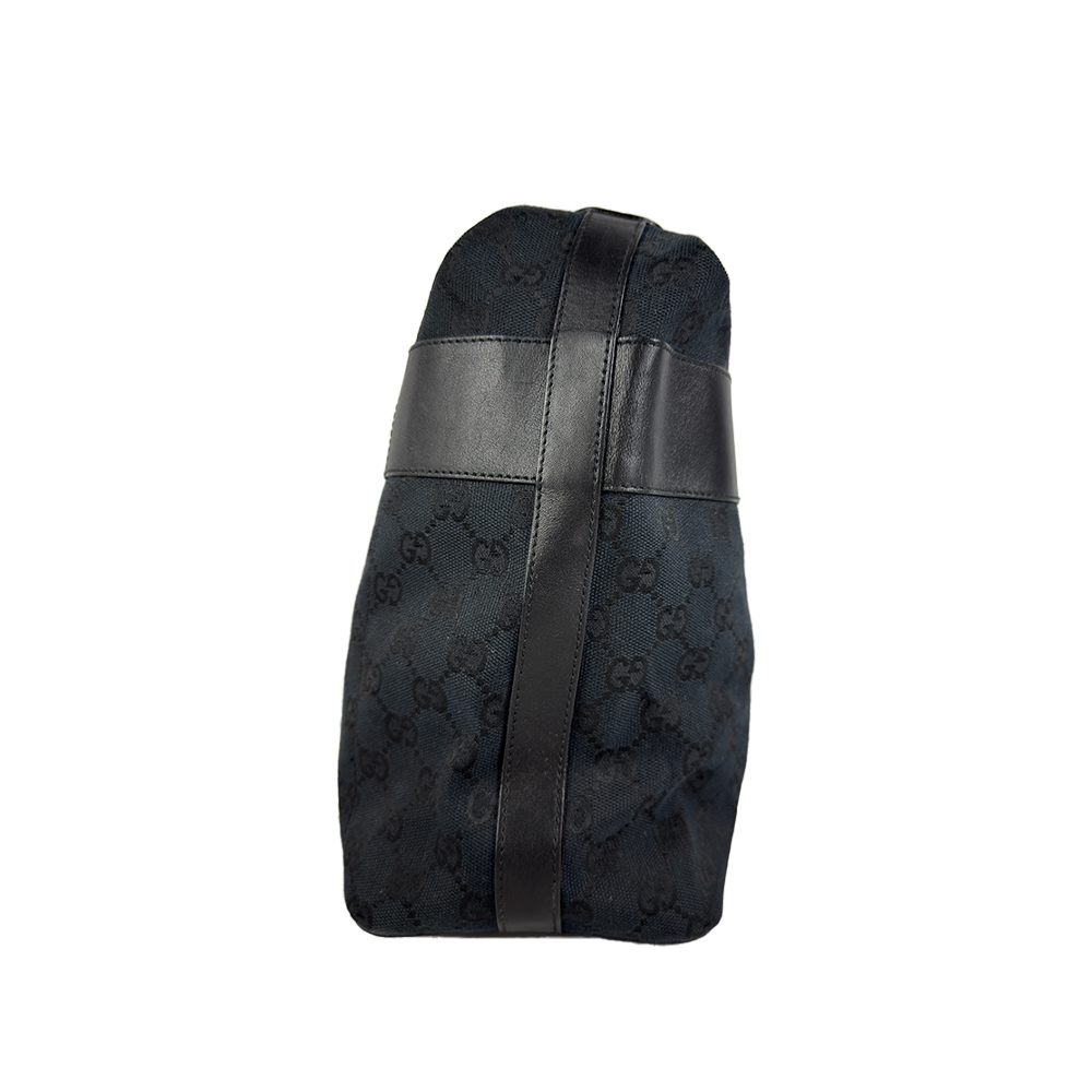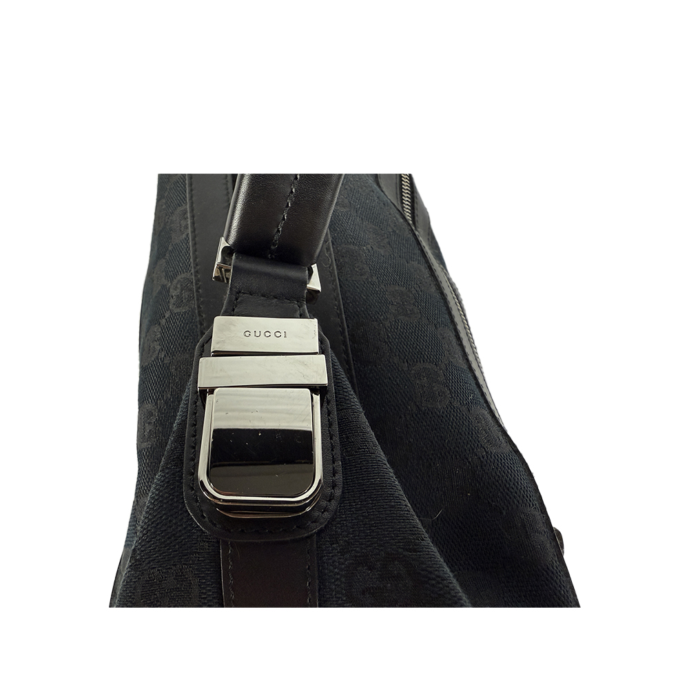 GUCCI BORSA A SPALLA-TRACOLLA, MODELLO GG Canvas nero in tessuto con dettagli in pelle nera targhetta frontale argentata con scritta Gucci chiusura superiore a zip una tasca esterna e una tasca interna modello 001-4298 002058 anno di produzione 1999-2002 h cm 28 x 29 x 15