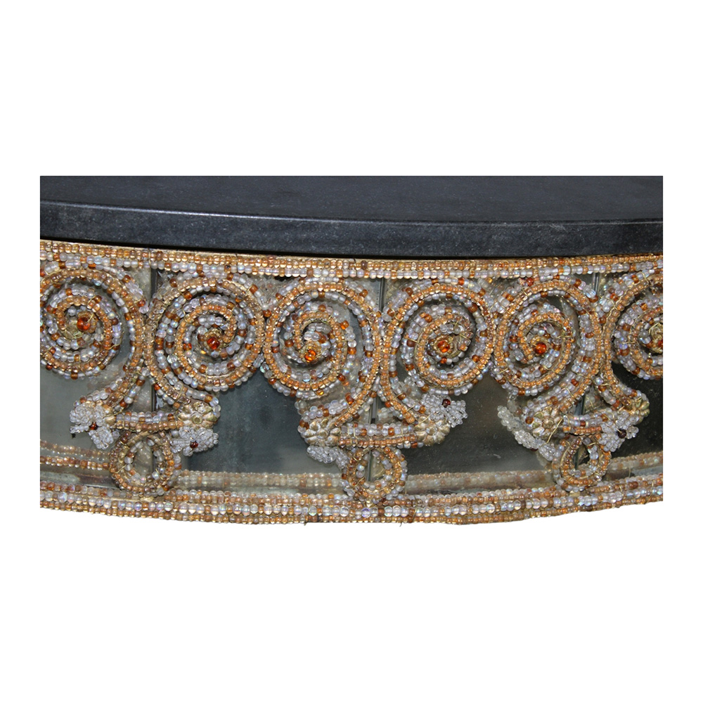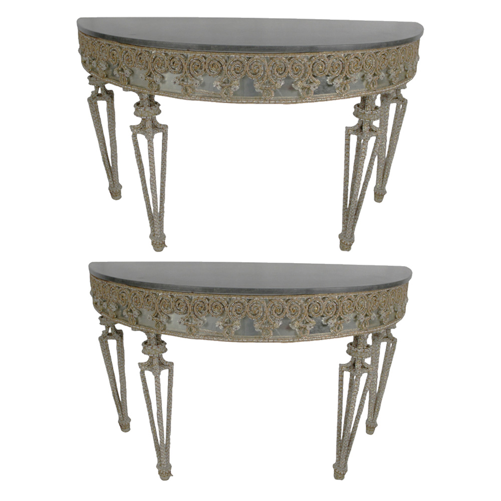 COPPIA CONSOLLE A MEZZA LUNA in ferro arricchita da perline in vetro e pasta di vetro piano in ardesia maestranze siciliane XIX/XX secolo h cm 92 x 154 x 66