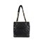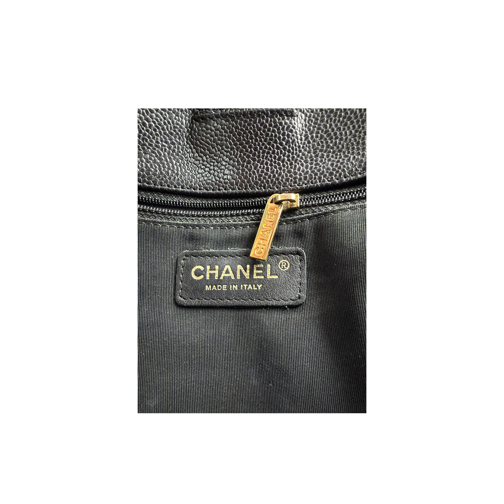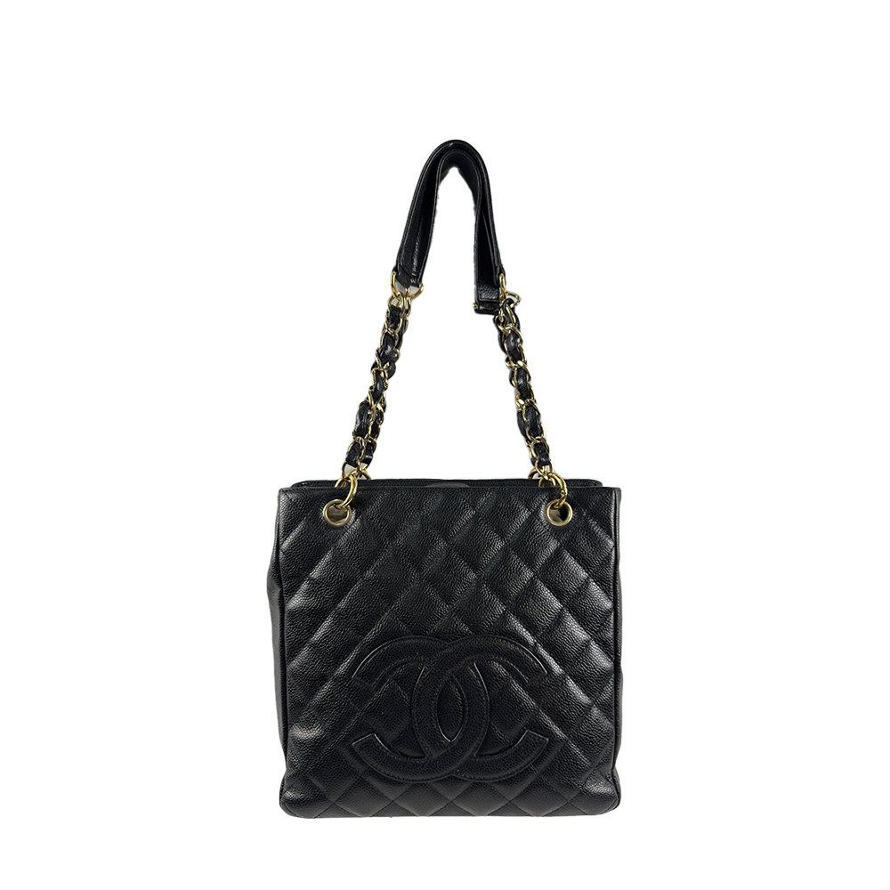 CHANEL, MODELLO PST (petite shopping tote) in pelle martellata caviar nera con hardware dorato, logo monogram con doppia C cucita tono su tono, doppi manici a catena intrecciata in pelle e metallo dorato, spallacci in pelle liscia, chiusura con bottone magnetico interno logato Chanel, tessuto nero a 2 scomparti uno con zip e 1 aperto. Italia anno di produzione 2004-2005 h cm 24 x 25 x 9