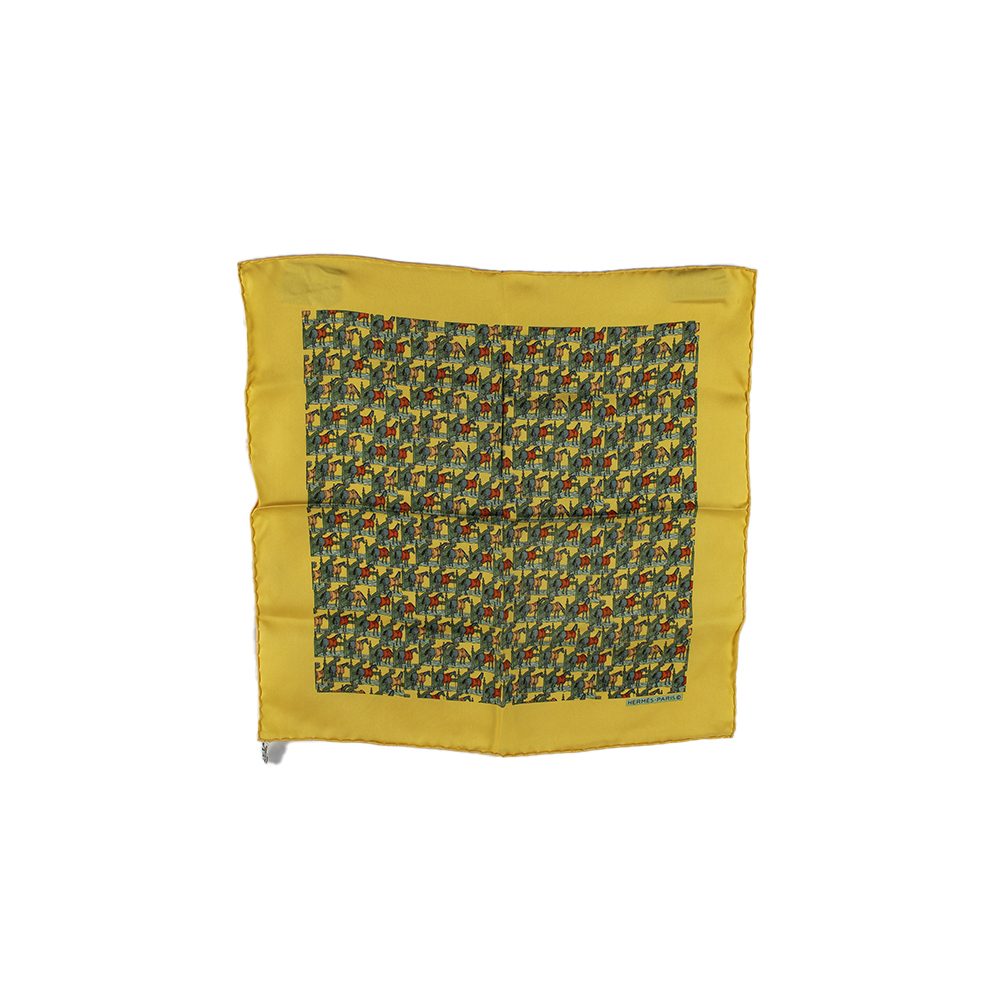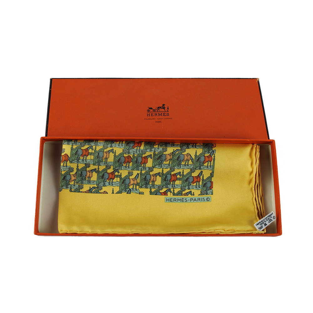 HERMÈS PARIS, raffinato fazzoletto da taschino in pura seta caratterizzato da una vivace stampa equestre su fondo giallo, scatola originale condizioni pari al nuovo. Inizi anni 2000 h cm 41 x 41