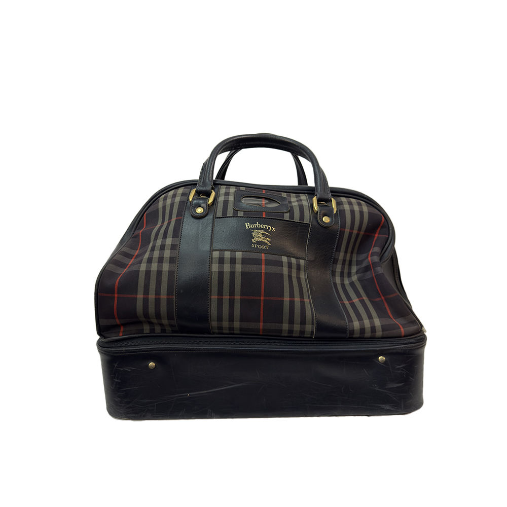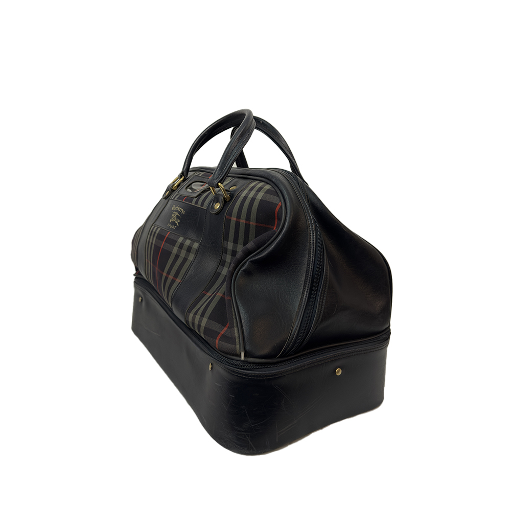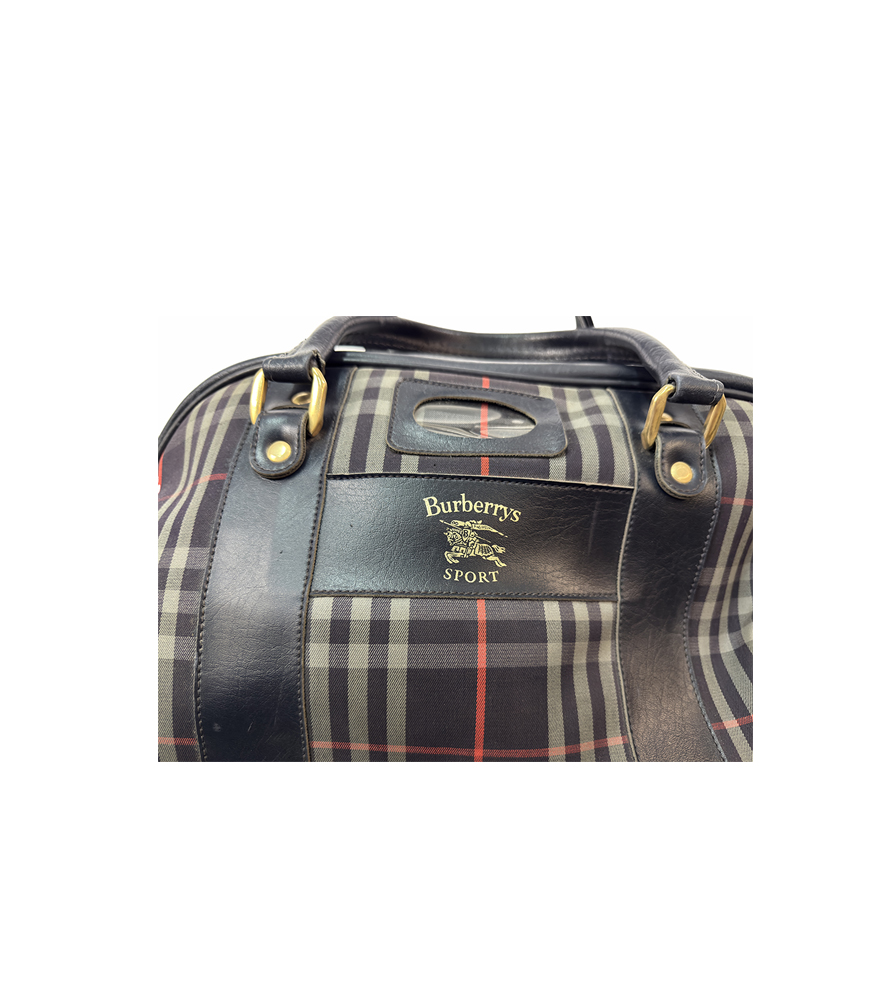 BURBERRYS, BORSONE VINTAGE realizzato in tela con il classico motivo check scozzese con finiture in pelle nera. Modello iconico Inglese fine anni 80 inizi anni 90' caratterizzato dal logo storico Burberrys. Chiusura superiore con zip e doppio manico in pelle. usure del tempo. h cm 36 x 47 x 28