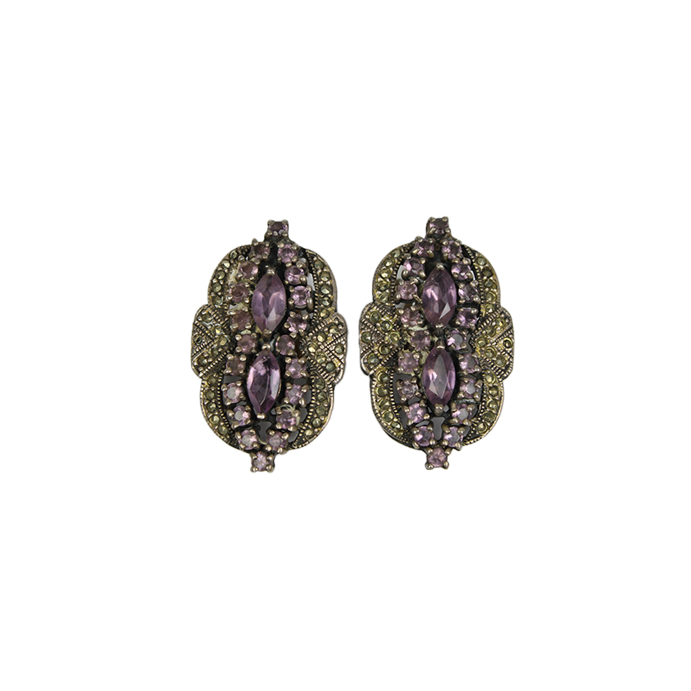 LOTTO COMPOSTO 3 oggetti di cui, 1 coppia di orecchini stile vintage realizzati in metallo argentato lavorato, decorati con marcassiti incastonati e due ametiste sfaccettate taglio navette, 1 orologio da donna in ottone lavorato e decori in smalto, ed 1 anello in argento con ametista incastonata taglio sfaccettato misure varie