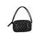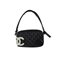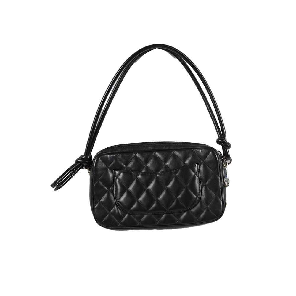CHANEL, ELEGANTE POCHETTE DELLA CELEBRE LINEA CAMBON in pelle nera trapuntata con l'iconico logo CC, chiusura con zip superiore, manico corto in pelle nera con nodo laterale, interno foderato in tessuto a motivo monogrammato fuxia con taschino laterale con zip, metà anni 2000' h cm 14 x 22 x 4