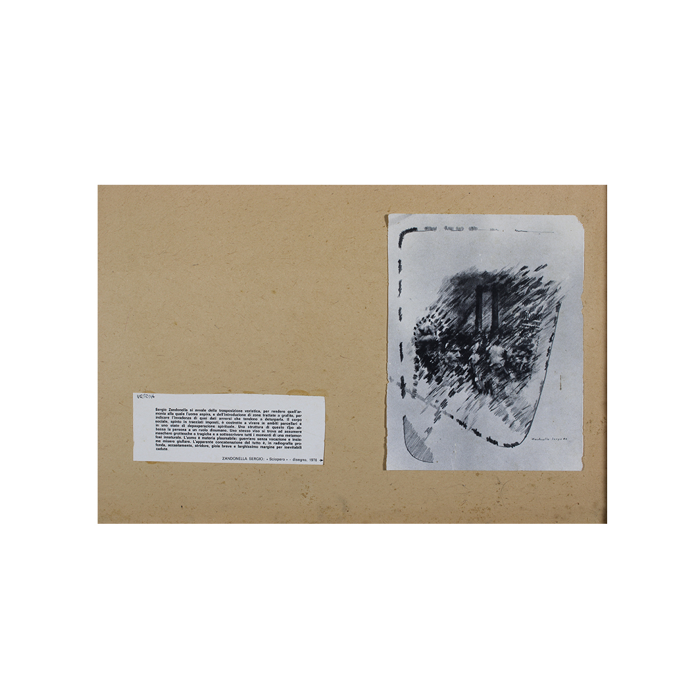 S. ZANDONELLA disegno a grafite su cartoncino Fabriano dal titolo Sciopero. Dentro cornice in metallo. Reca firma in basso a dx ed informativa e foto dell'opera sul retro. Leggera lesione in basso a dx al vetro della cornice. h cm 83 x 63