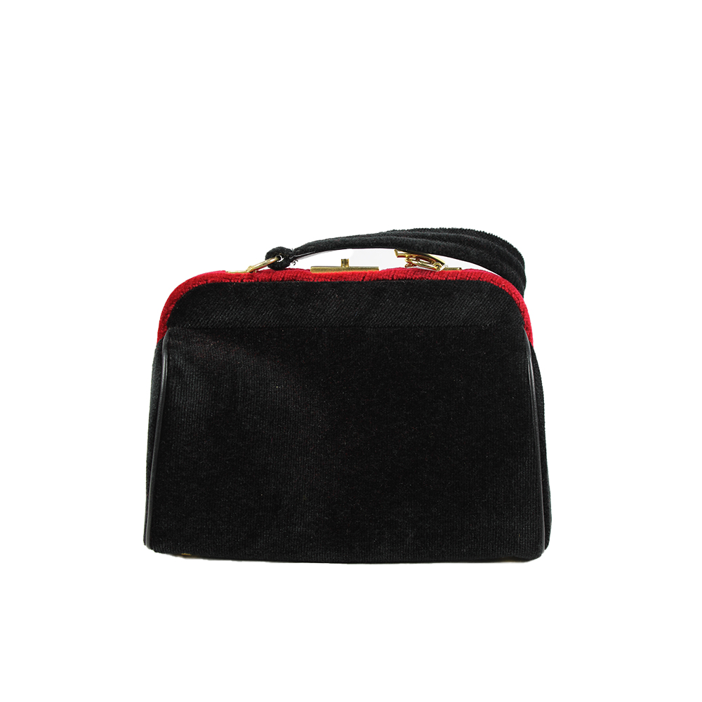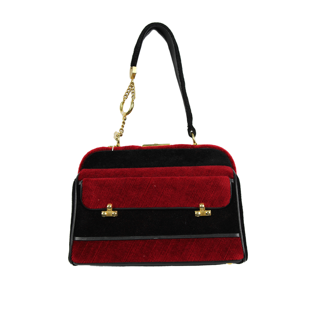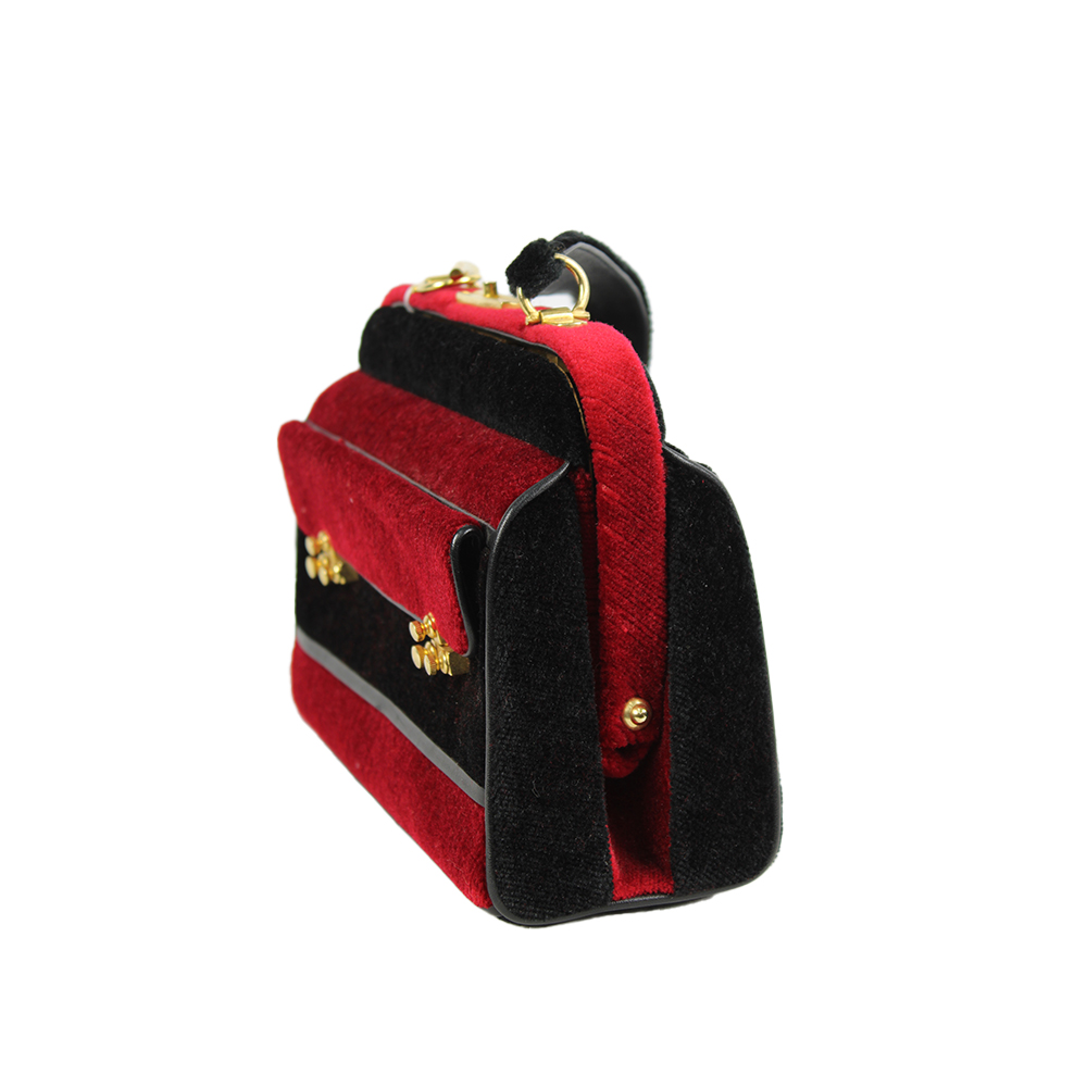 SPULCIONI FIRENZE, ELEGANTE BORSA DA SERA VINTAGE in velluto bicolore rosso e nero con finiture dorate, struttura rigida e chiusura a scatto, particolare doppio decoro frontale con due chiavistelli dorati, interno foderato in pelle nera con taschino e zip, manico corto con gancio a catena più secondo manico per la prolunga. buone condizioni generali con lievi segni d'uso. Storica manifattura fiorentina anni 60'/70' h cm 17,5 x 23 x 9,5