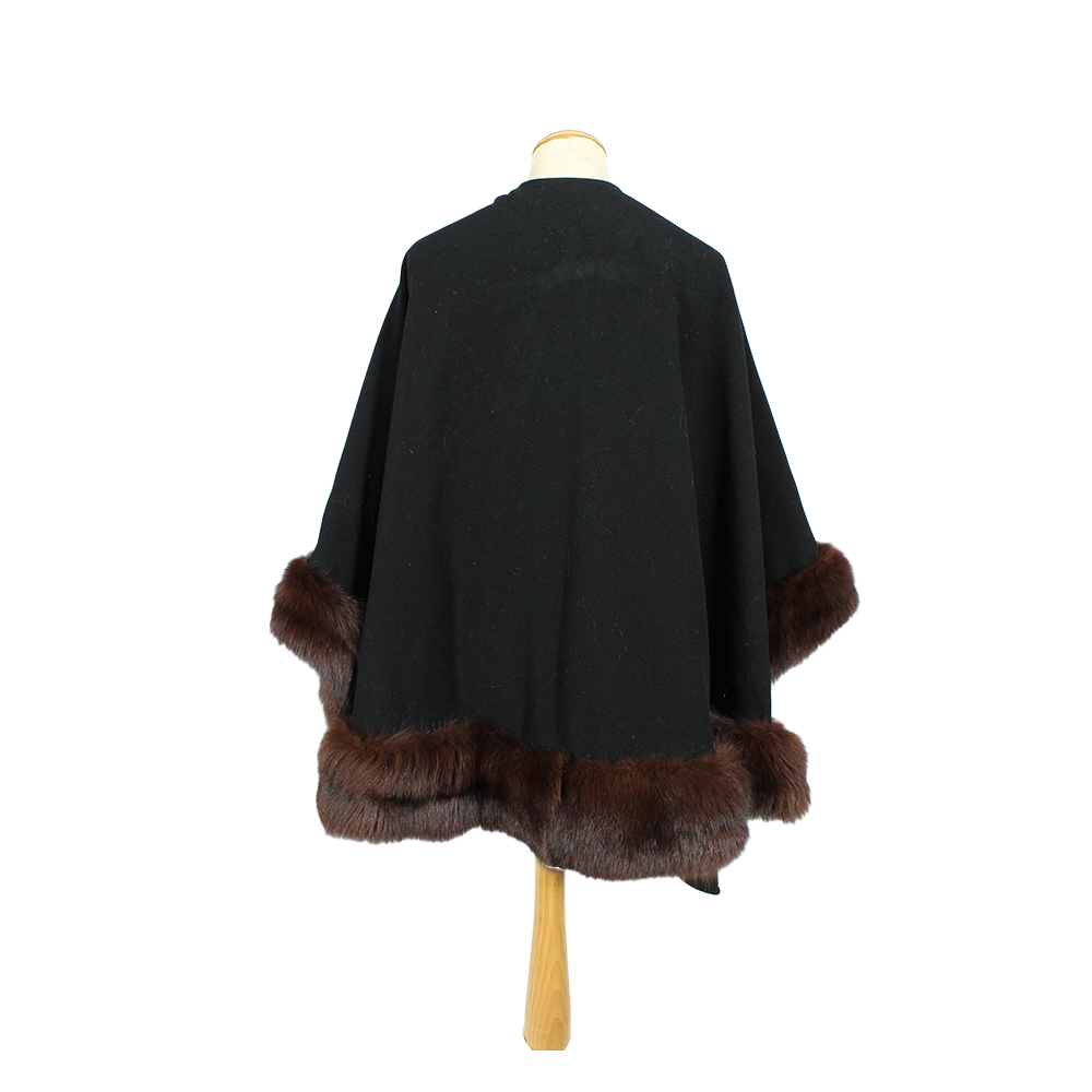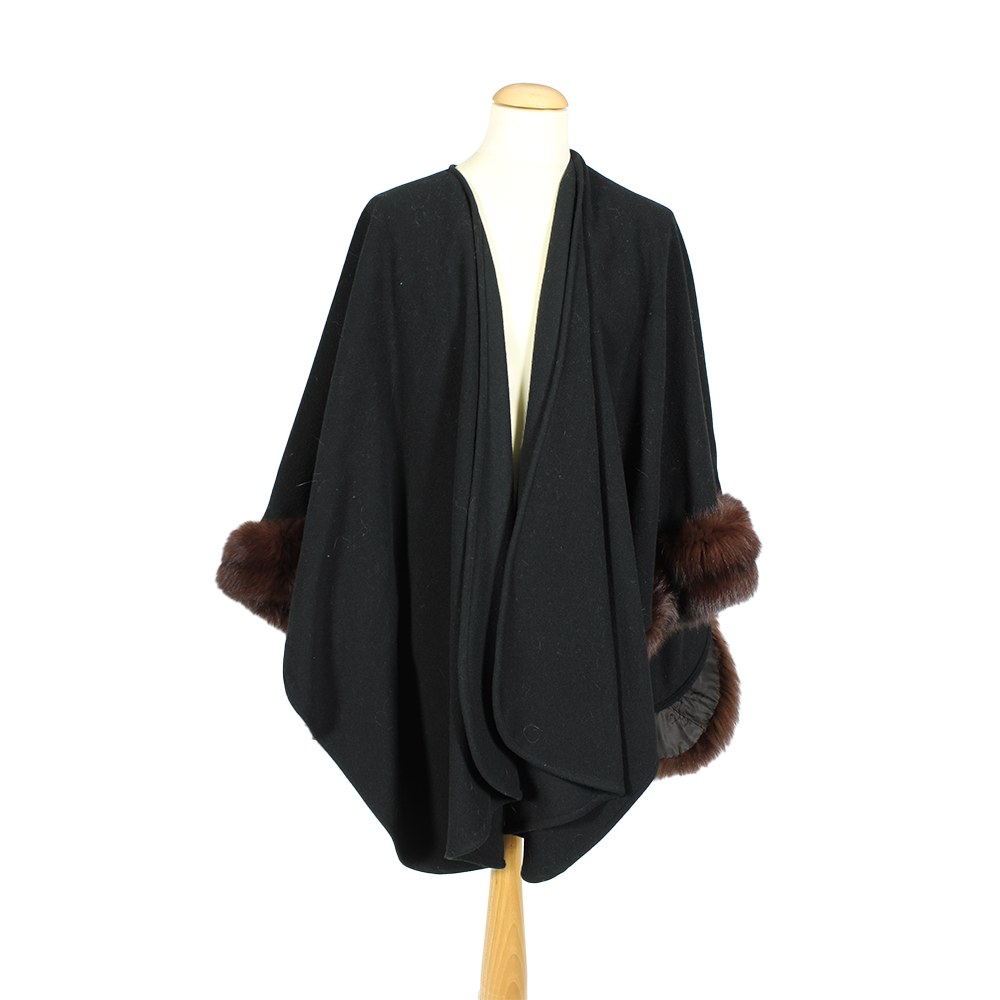LOTTO COMPOSTO DA Elegante mantella in panno di lana nero con inserti in pelliccia di volpe nei bordi di colore marrone intenso lungo l'orlo inferiore e i polsini. Internamente rifinita con fodera in raso lucido. un collo in pelliccia di visone con riflessi lucidi, e un collo in pelliccia di volpe colore chiaro con sfumature beige, entrambi foderati internamente con tessuto scuro e dotati di ganci per fissaggi su cappotti o mantelle, ideale per arricchire capi eleganti o d'epoca. Italia anni 70'/90'