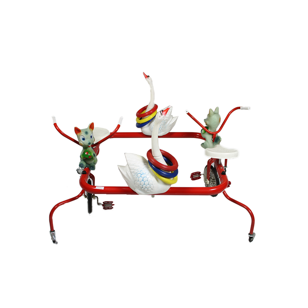 GIOSTRINA PER BAMBINI con cigni e animali, struttura in metallo verniciato rosso con due sedili dotati di manubrio, sella e pedali, produzione italiana anni 60-70 h cm 73 x 103 x 88
