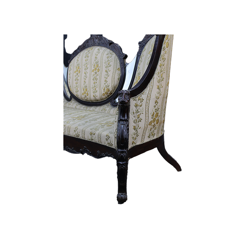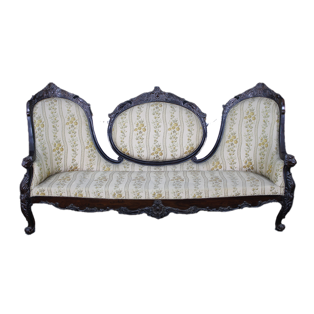 GRANDE DIVANO in legno di noce riccamente scolpito raffigurante figure leonine Sicilia primi 800 h 127 x 230 x 80