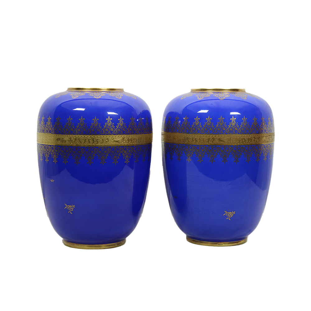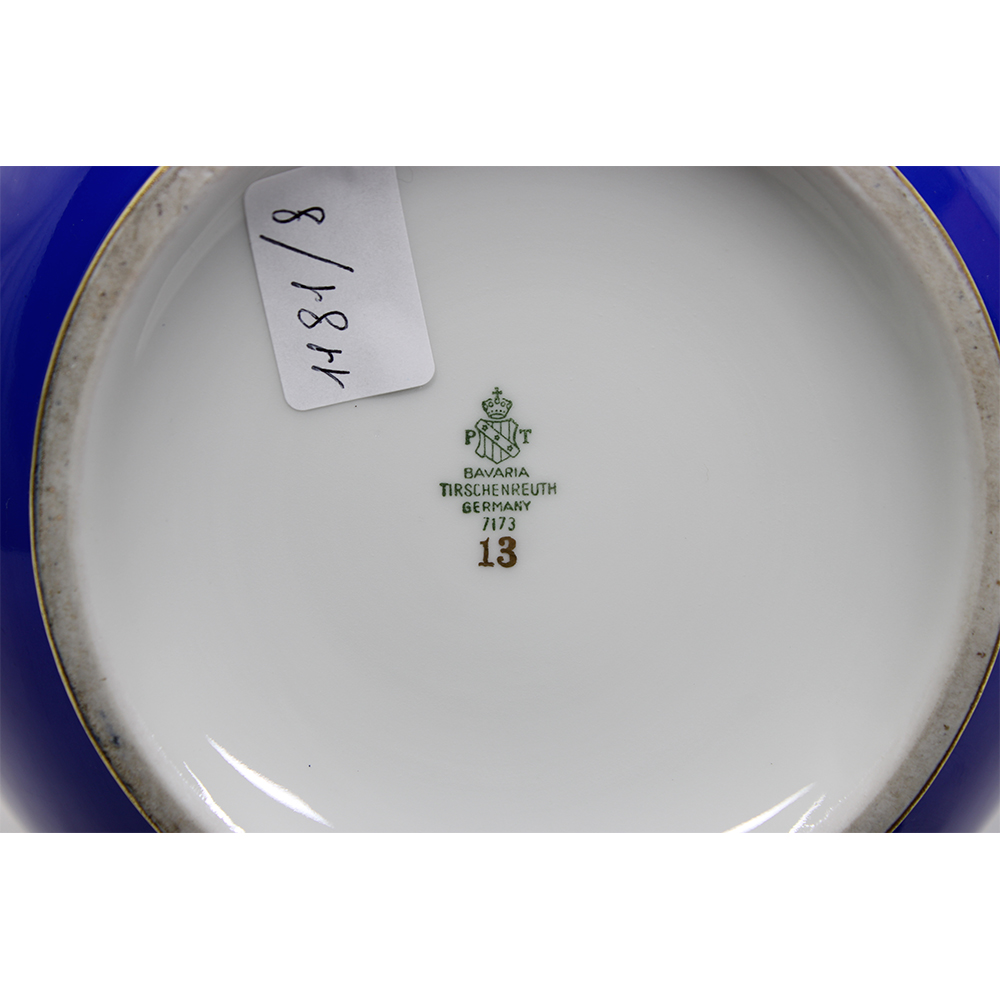 COPPIA DI VASI in porcellana a fondo blu cobalto con lumeggiature in oro dentro riserva scene galanti manifattura PT Bavaria TIRSCHENREUTH Germania h cm 27 x Ø 20