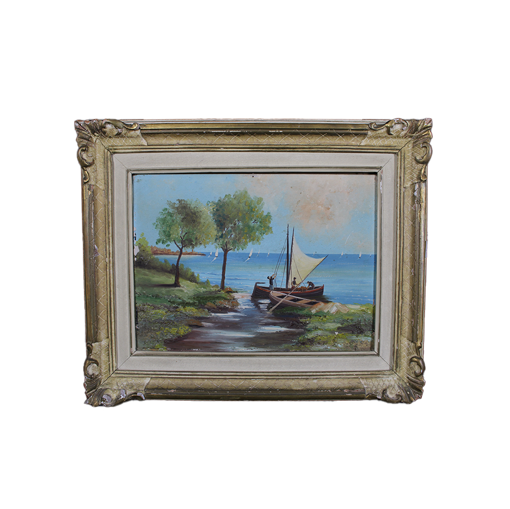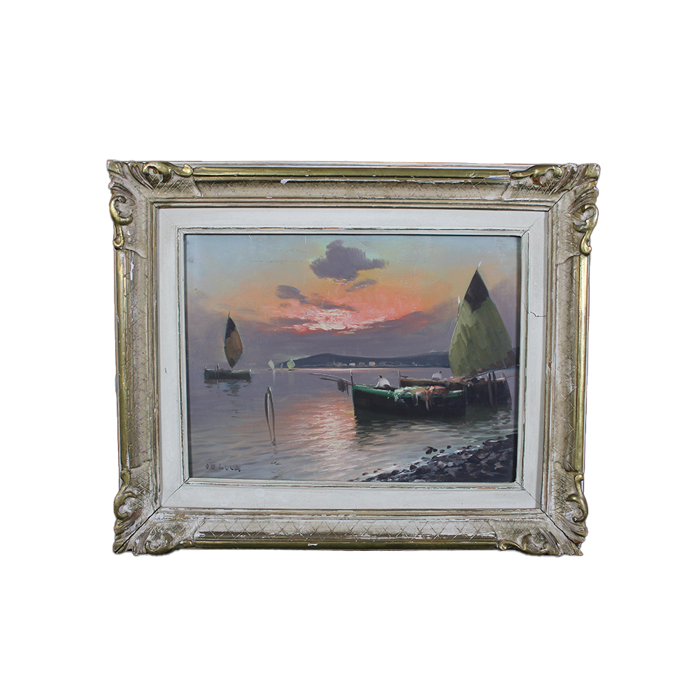 DUE DIPINTI DI CUI 1 olio su compensato raffigurante marina con barche e pescatori e 1 olio su tela raffigurante marina con pescatori a firma De Luca h cm 28 x 38 / h cm 45 x 55