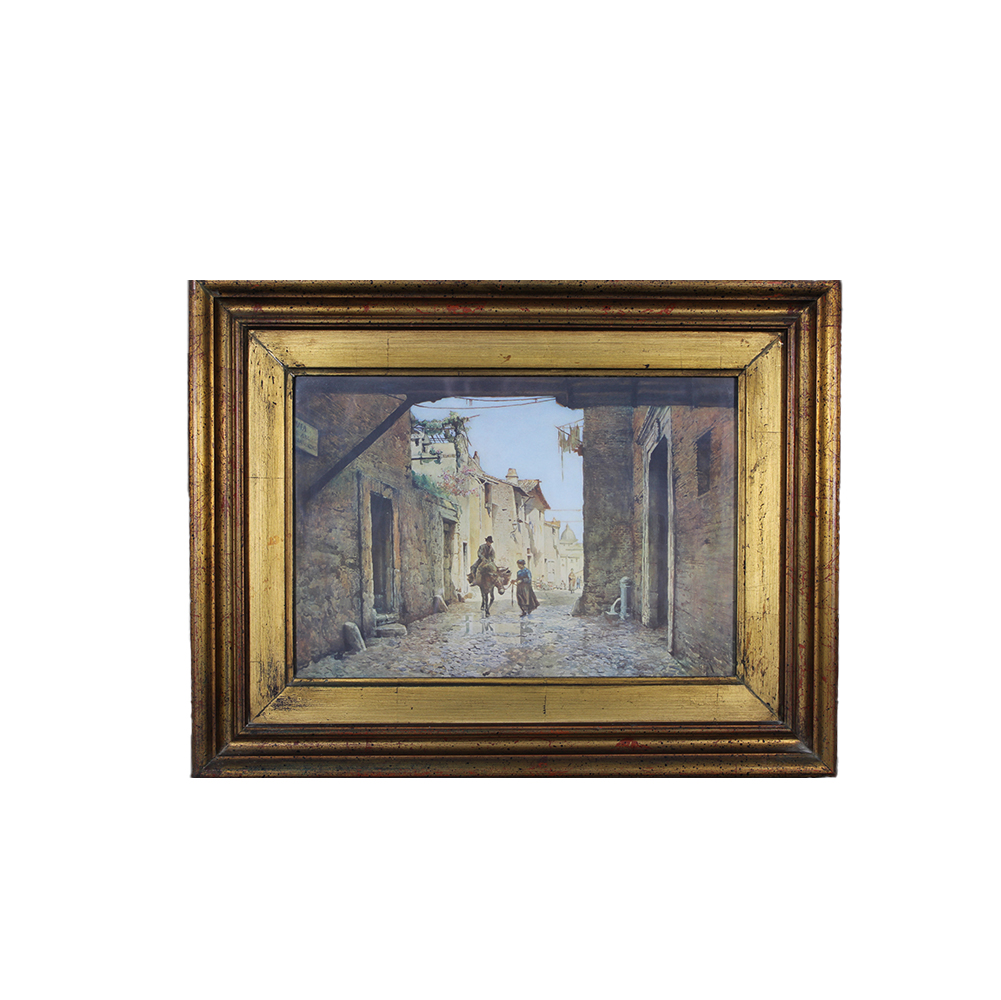 STAMPA COLORATA DENTRO CORNICE raffigurante scorcio di paese con personaggi firma illeggibile primi 900 h cm 43 x 55