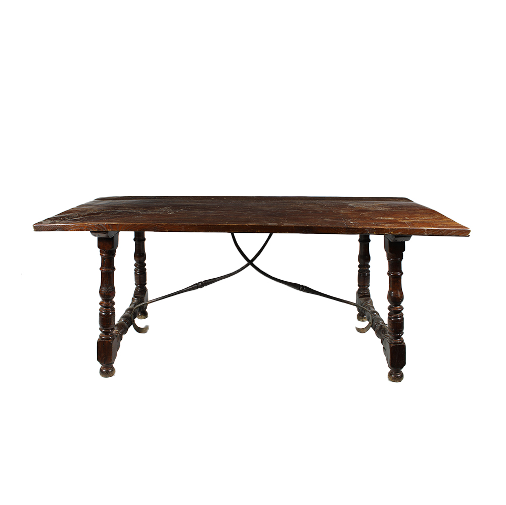 TAVOLO FRATINO in legno di castagno con gambe a rocchetto e asse in ferro maestranze fiamminghe XVIII-XIX secolo h cm 79 x 191 x 82,5