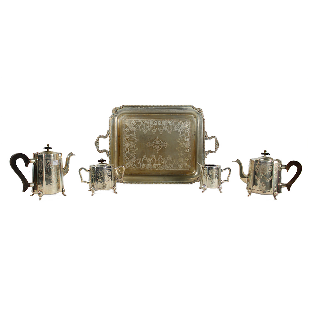 SERVIZIO 5 PEZZI composto da teiera, caffettiera,lattiera, zuccheriera e vassoio in sheffield finemente cesellato manifattura Royal Old Britain Sheffield Inghilterra XX secolo misure varie