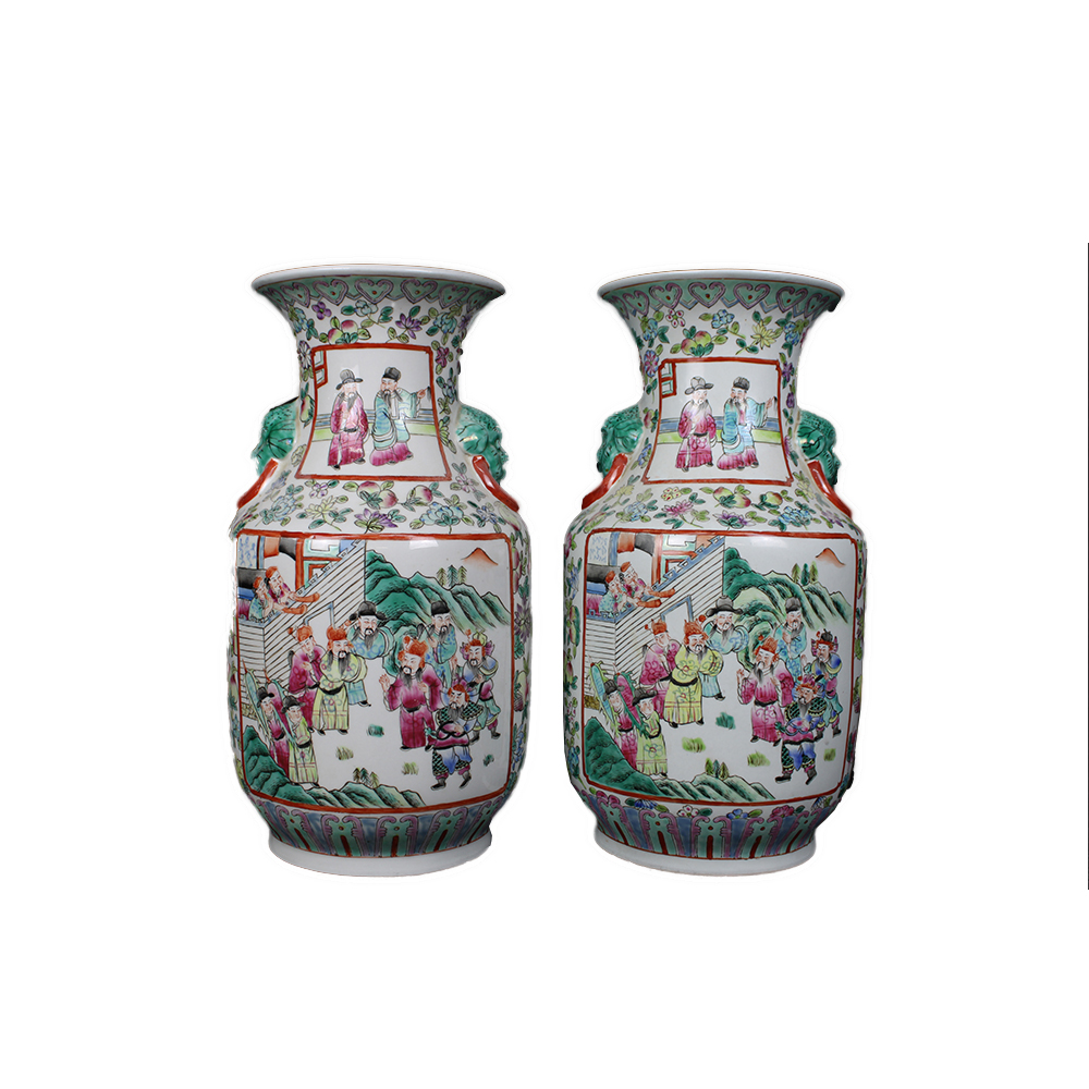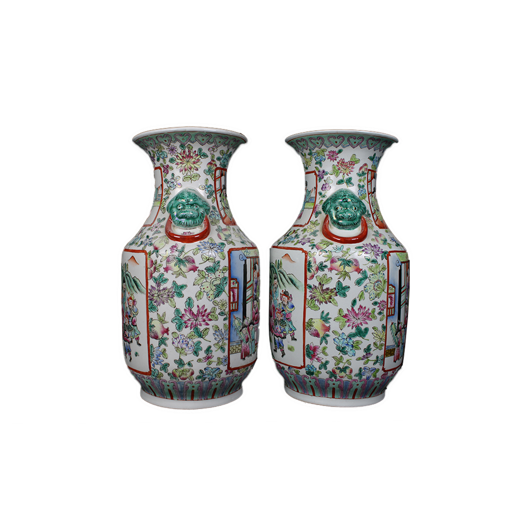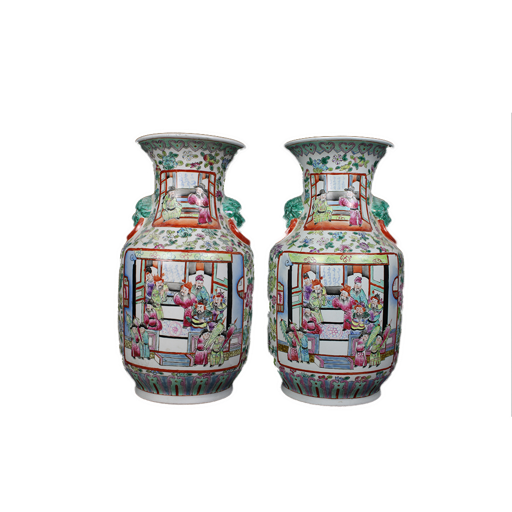 COPPIA DI VASI in porcellana dipinta raffigurante scene di vita maestranze orientali XX secolo h cm 35 x 19