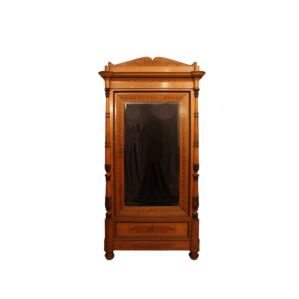 ARMADIO CARLO X in acero, riccamente decorato da estese tarsie in palissandro. Anta con specchio e tiretto sottostante. Lesene arricchite da colonne tornite e cimasa con modanatura aggettante ed intarsiata XIX secolo Sicilia h cm 230 x 116 x 55