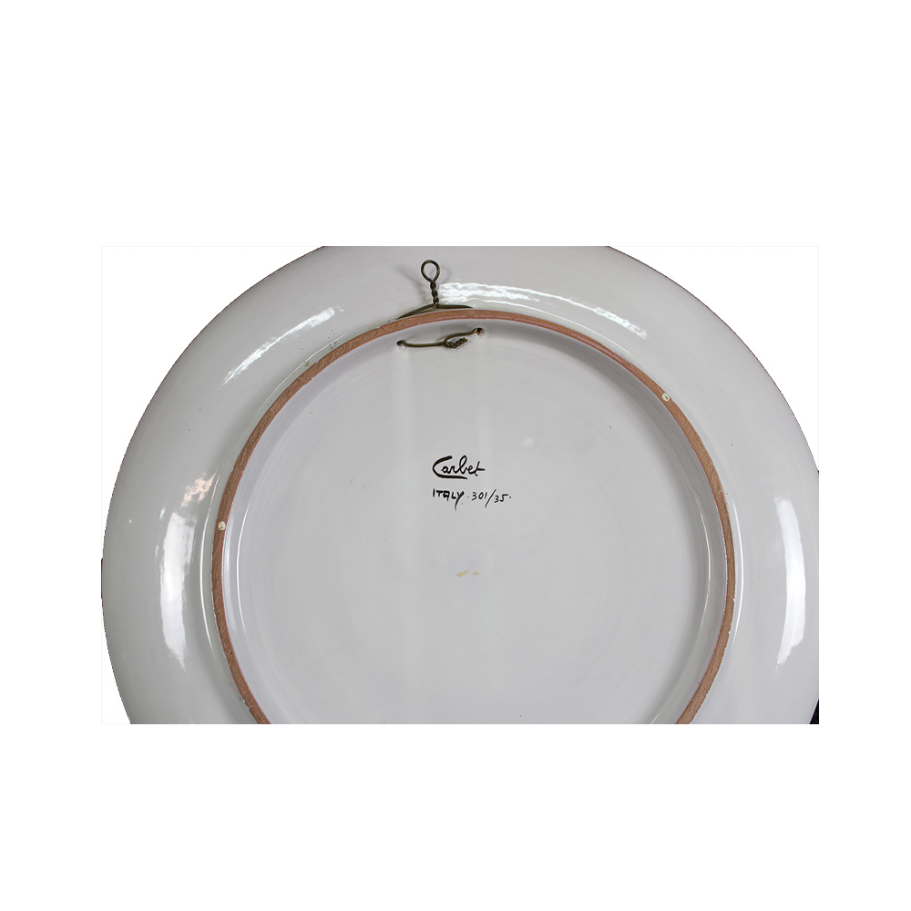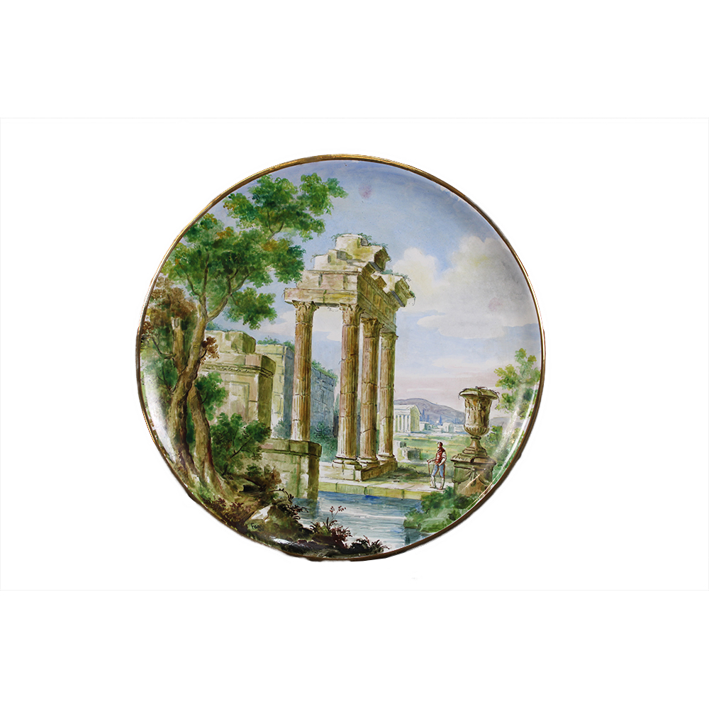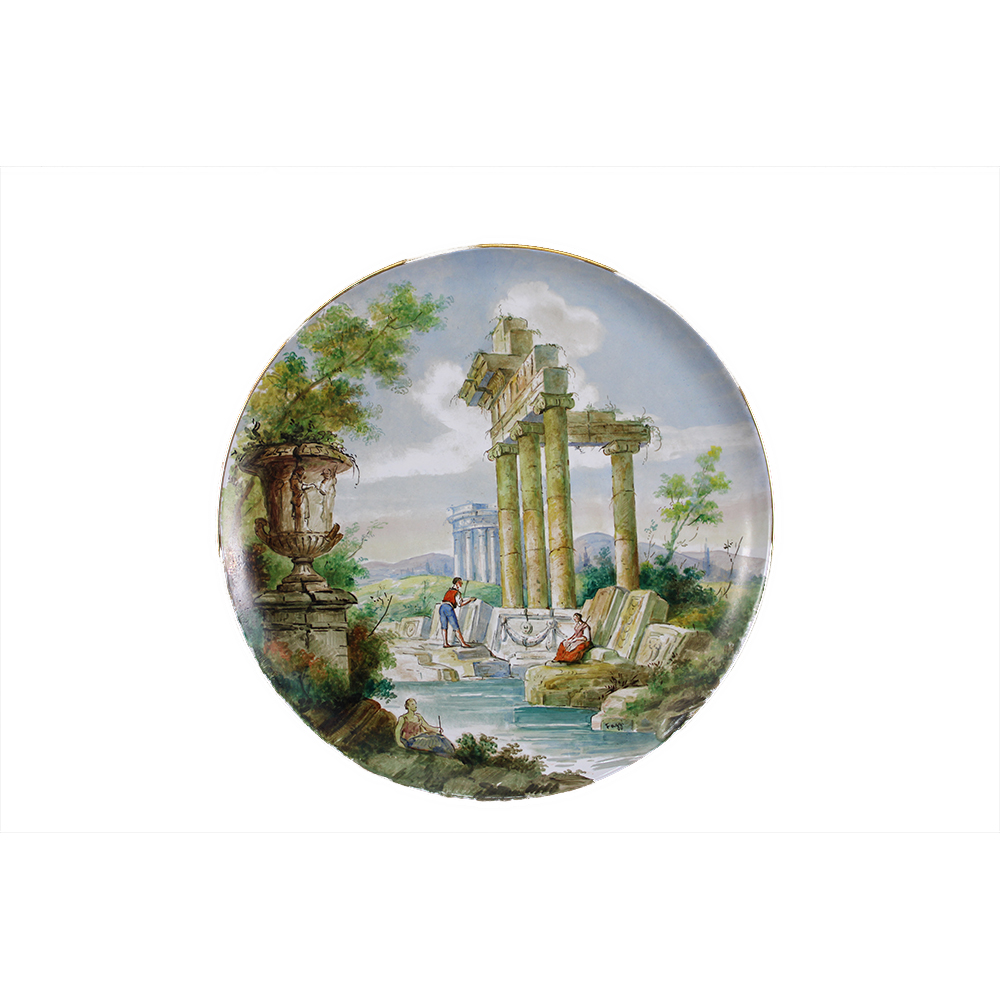 COPPIA DI PIATTI ISTORIATI in porcellana raffigurante rovine manifattura Cabert Italia 301/35 a firma Faggi anni 50 cm Ø 35,5