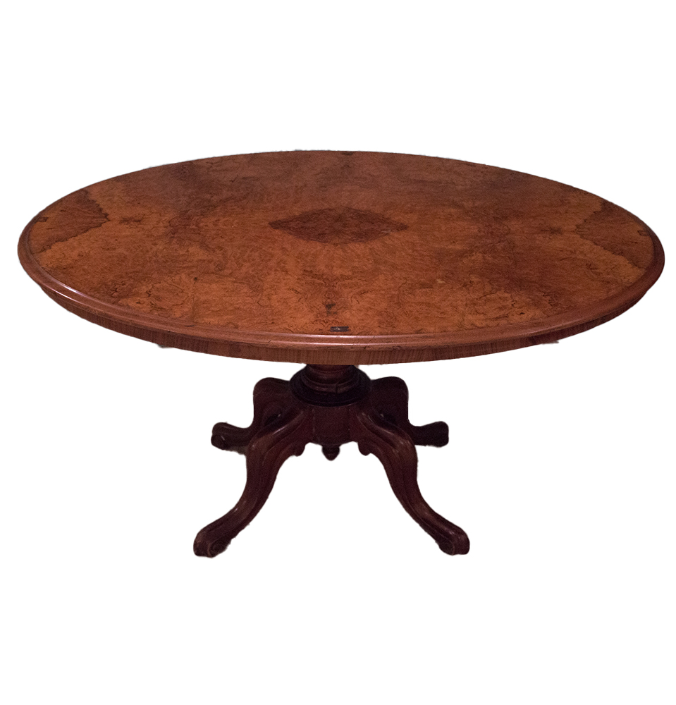 TAVOLINO OVALE in radica di noce Inghilterra XIX secolo h cm 69 x 129 x 83