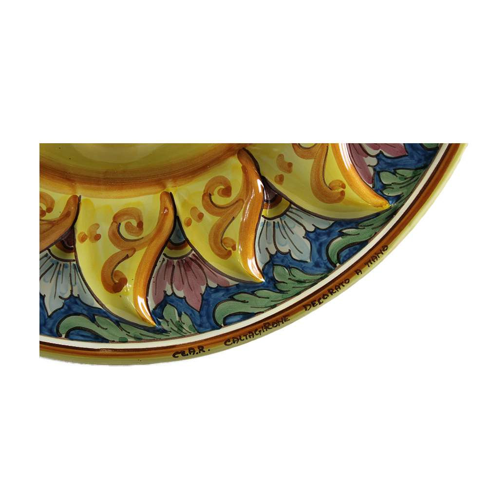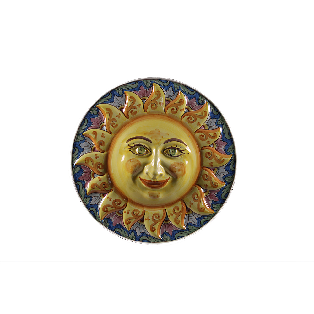 PLACCA in maiolica policroma raffigurante sole firmato CP.A.R. Caltagirone XX secolo cm Ø 44