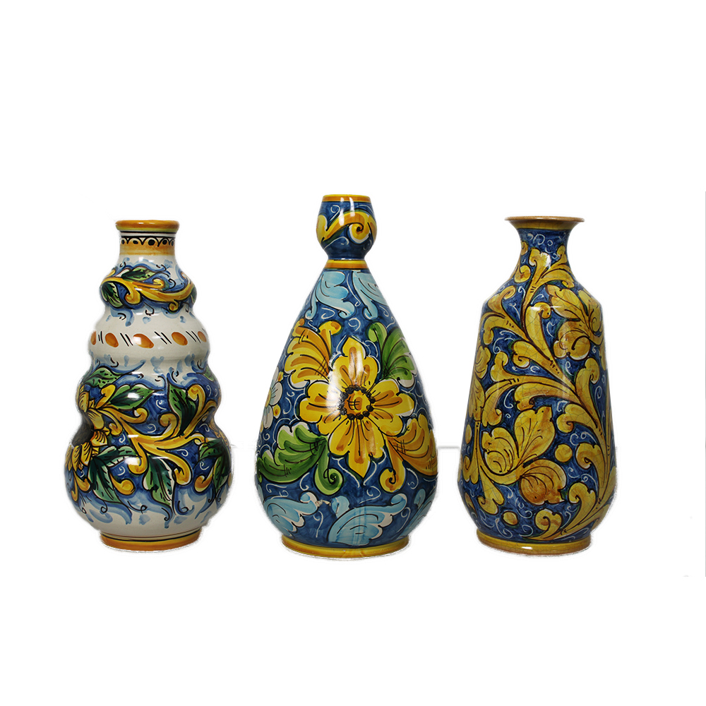 LOTTO DI 3 VASI in maiolica dipinta in policromia manifattura La Fornace di Bisanzio Monreale XX secolo h cm 29,5 - h cm 27,5 - h cm 27