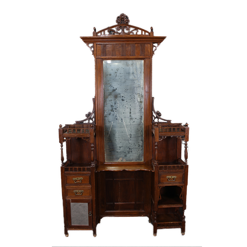 MOBILE TOLETTA LIBERTY composto da due mobiletti laterali con specchiera centrale in legno di noce scolpito e tornito Sicilia fine XIX h cm 230 x 125 x 28