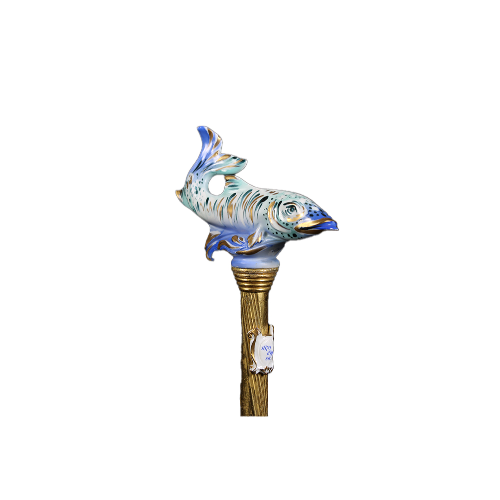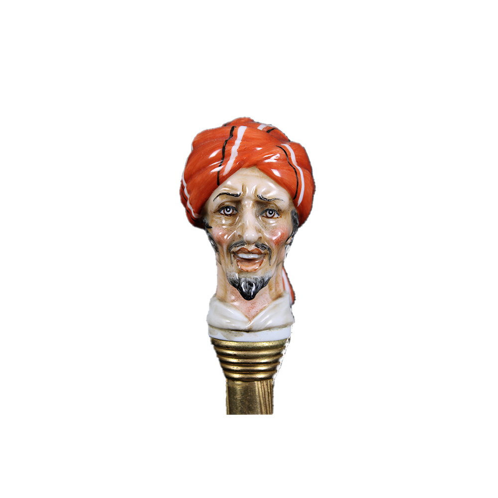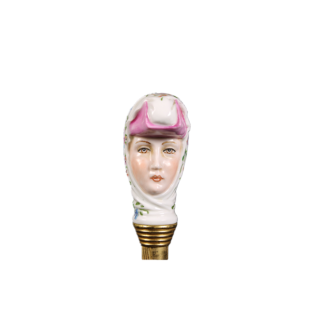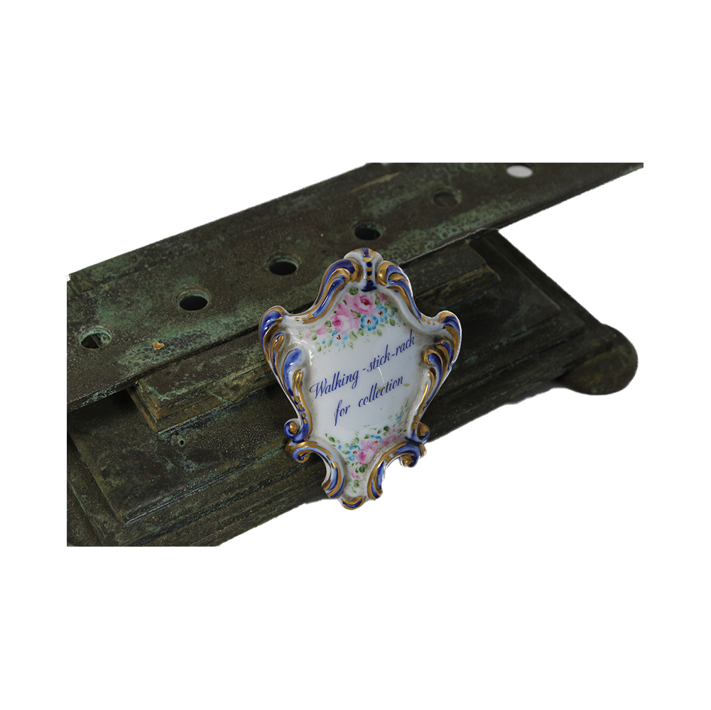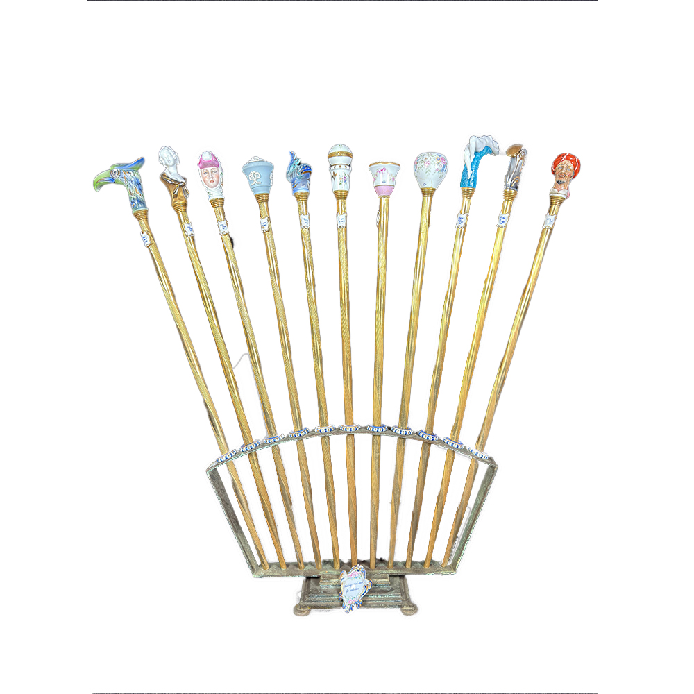IMPORTANTE COLLEZIONE DI 11 BASTONI DA PASSEGGIO con fusto in metallo dorato e manico in porcellana dipinta a policromia e lumeggiature in oro da modelli ottocenteschi della fabbrica Capodimonte Ferdinandea raffigurante diverse tipologie tra cui porta pillole, orologio, animali e personaggi , bastoniera in ottone brunito arricchita da elementi in porcellana manifattura Tiche XX secolo