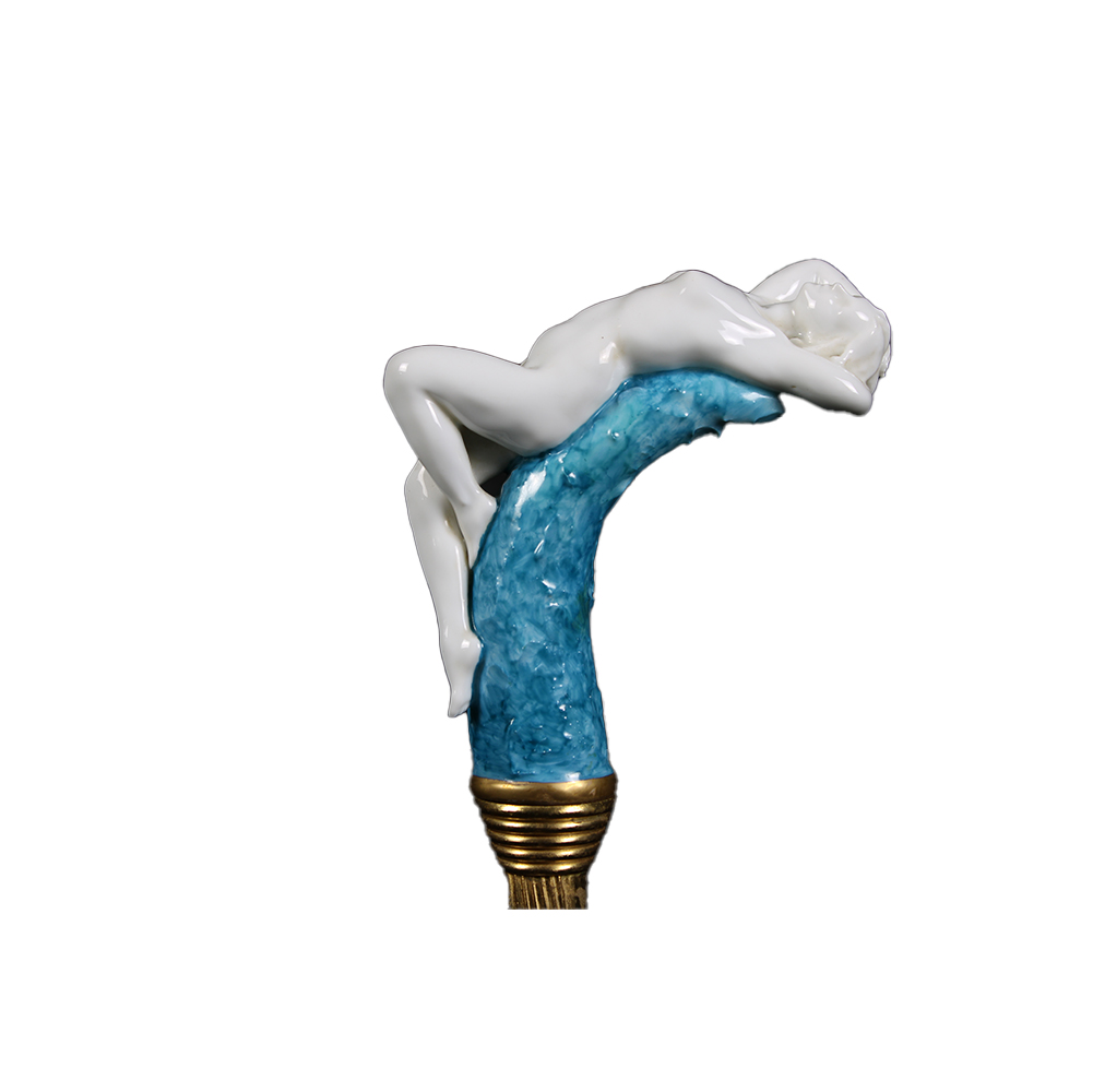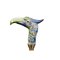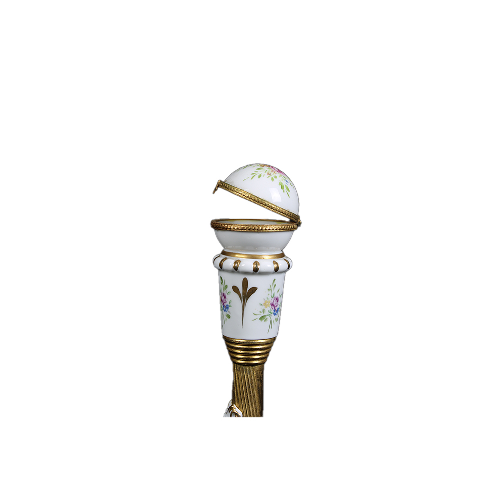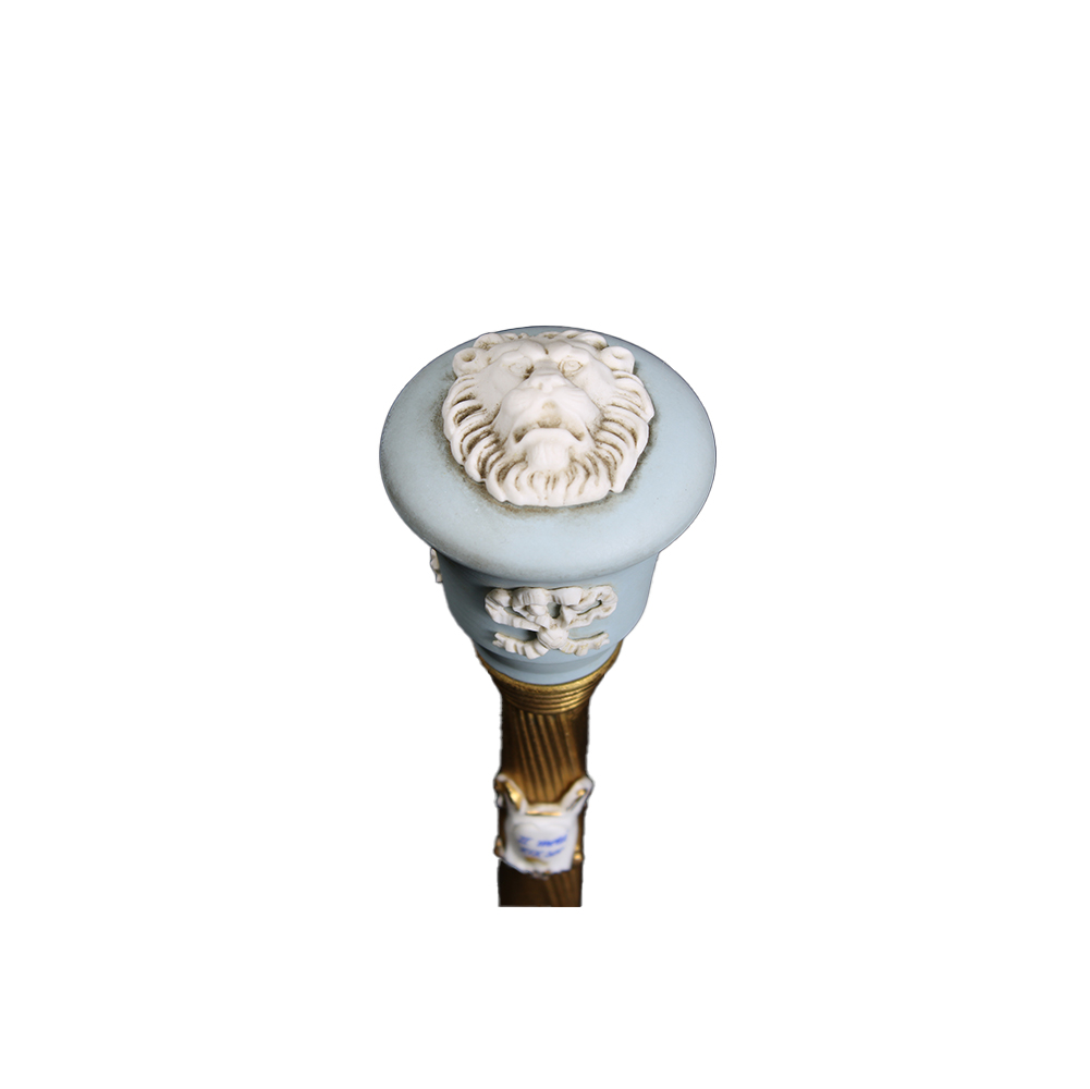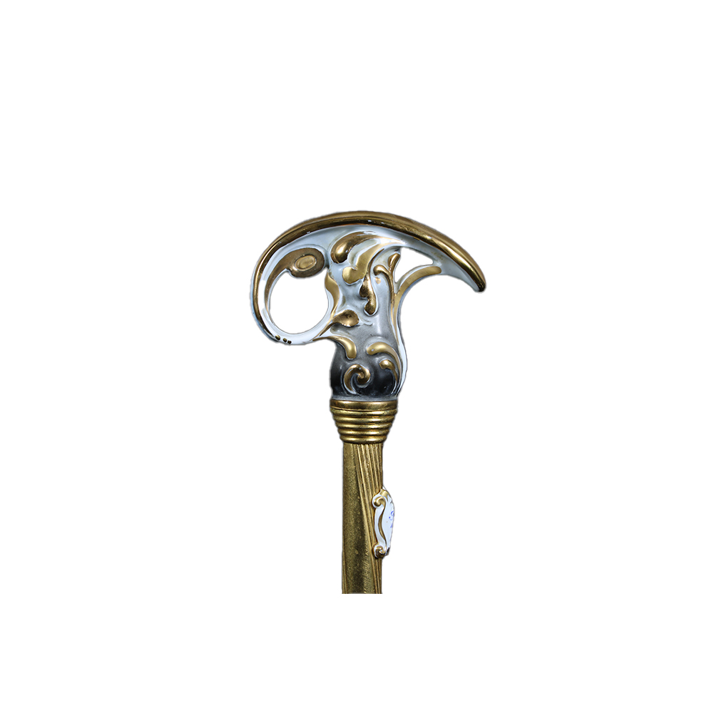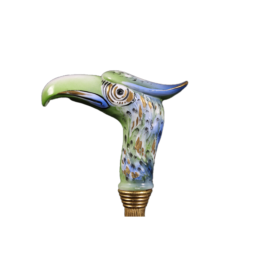 IMPORTANTE COLLEZIONE DI 11 BASTONI DA PASSEGGIO con fusto in metallo dorato e manico in porcellana dipinta a policromia e lumeggiature in oro da modelli ottocenteschi della fabbrica Capodimonte Ferdinandea raffigurante diverse tipologie tra cui porta pillole, orologio, animali e personaggi , bastoniera in ottone brunito arricchita da elementi in porcellana manifattura Tiche XX secolo