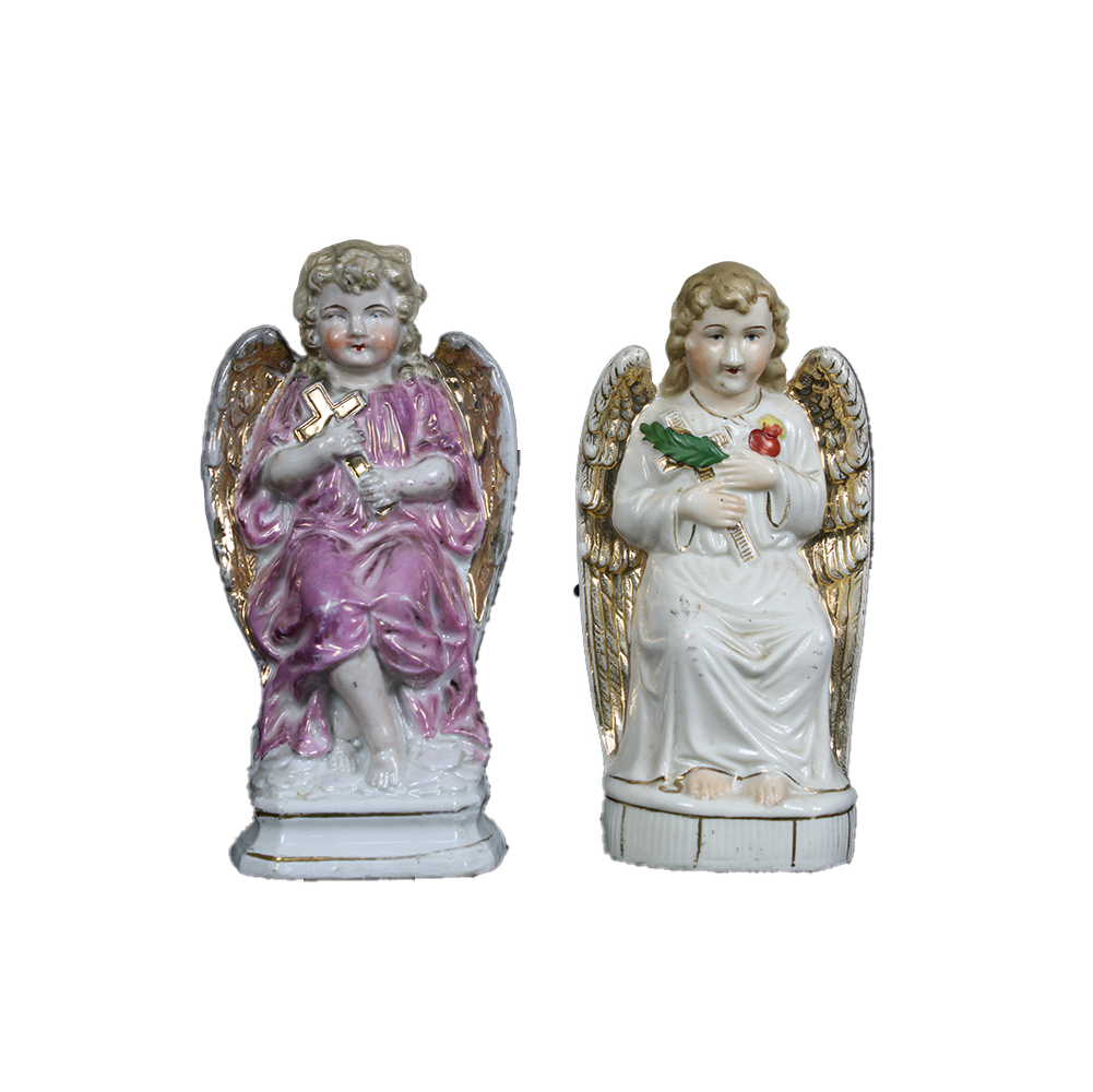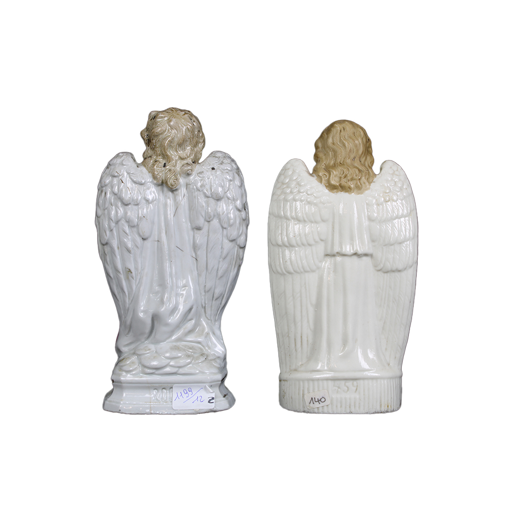 DUE SCULTURE raffigurante angeli in porcellana dipinta in policromia con lumeggiature in oro maestranze francesi XIX/XX secolo h cm 20 x 10 x 7,5 - h cm 19 x 9,5 x 7